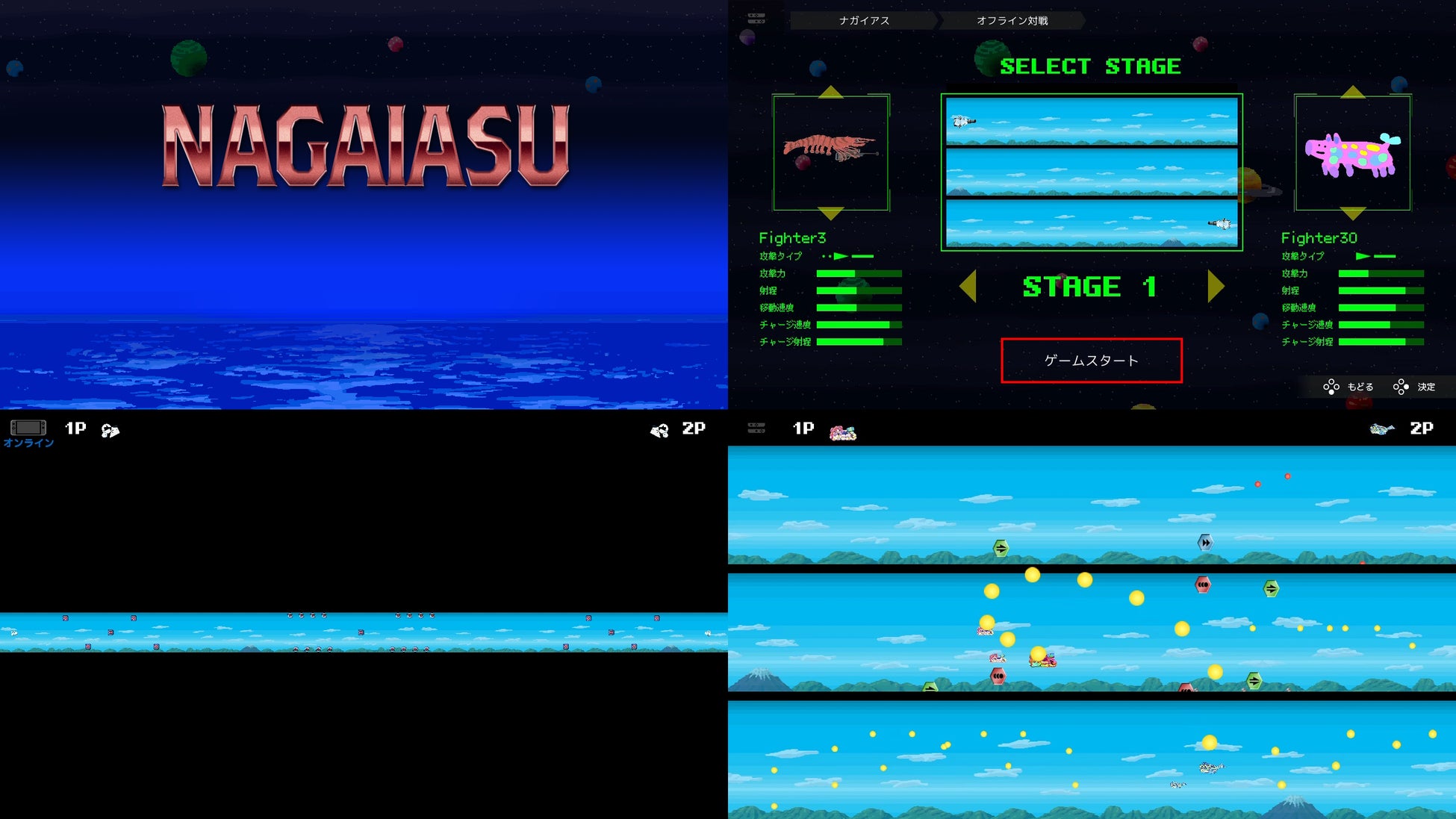 横スクロールのシューティングゲームの長い長いステージが、なんと1画面に収まった形に。スタート地点から最後のボスをいきなり狙うこともできます。2人プレイは、お互いに撃ち合う対戦形式です。