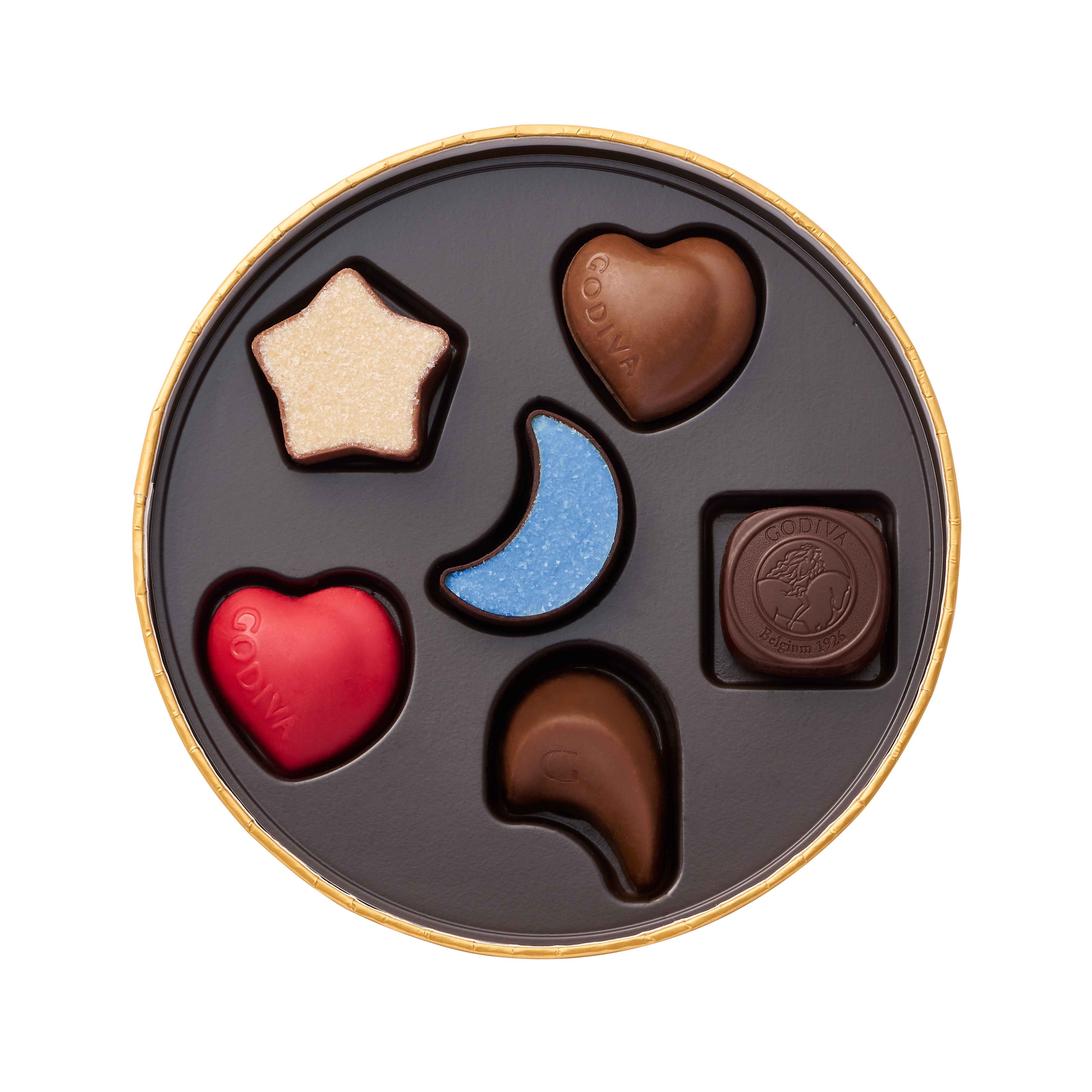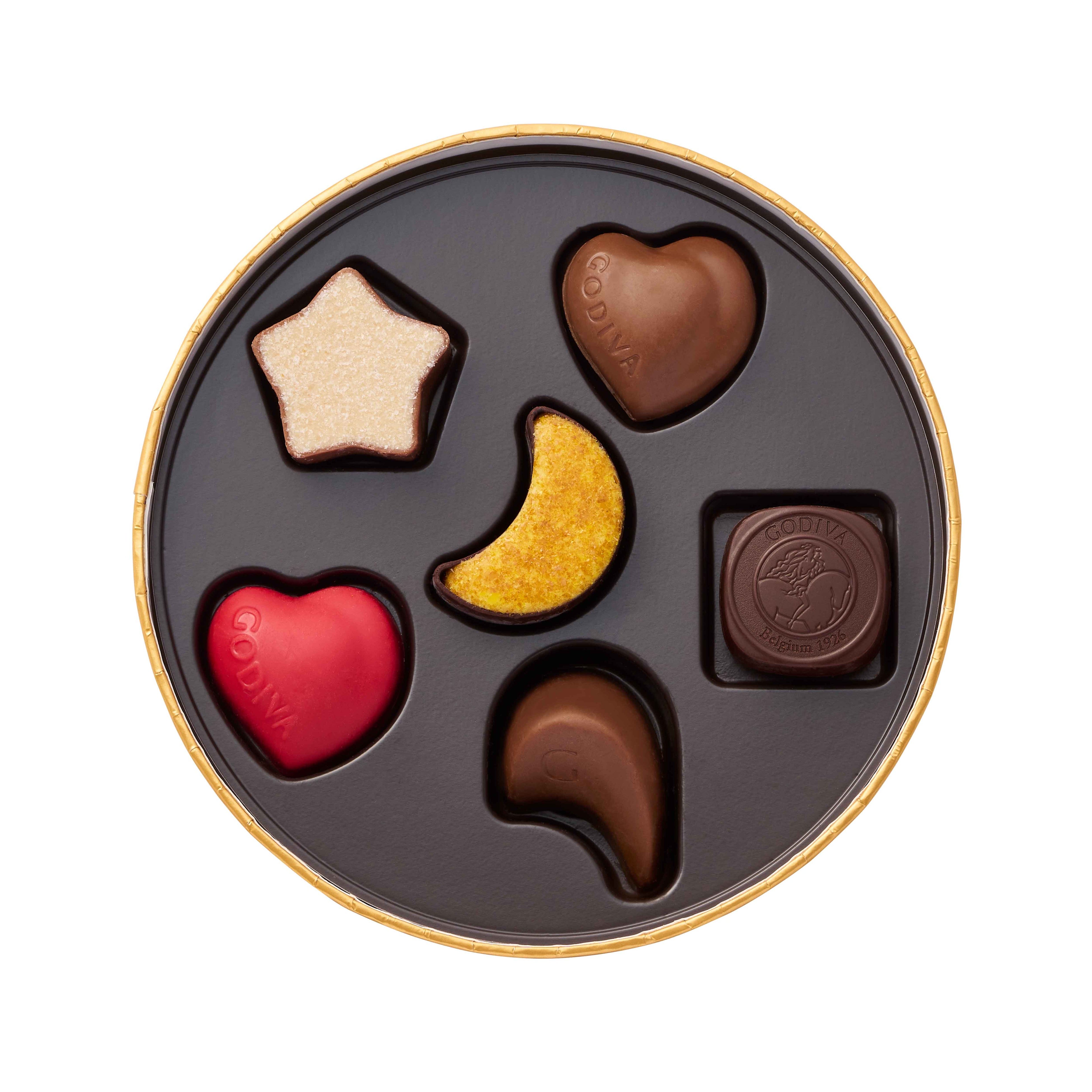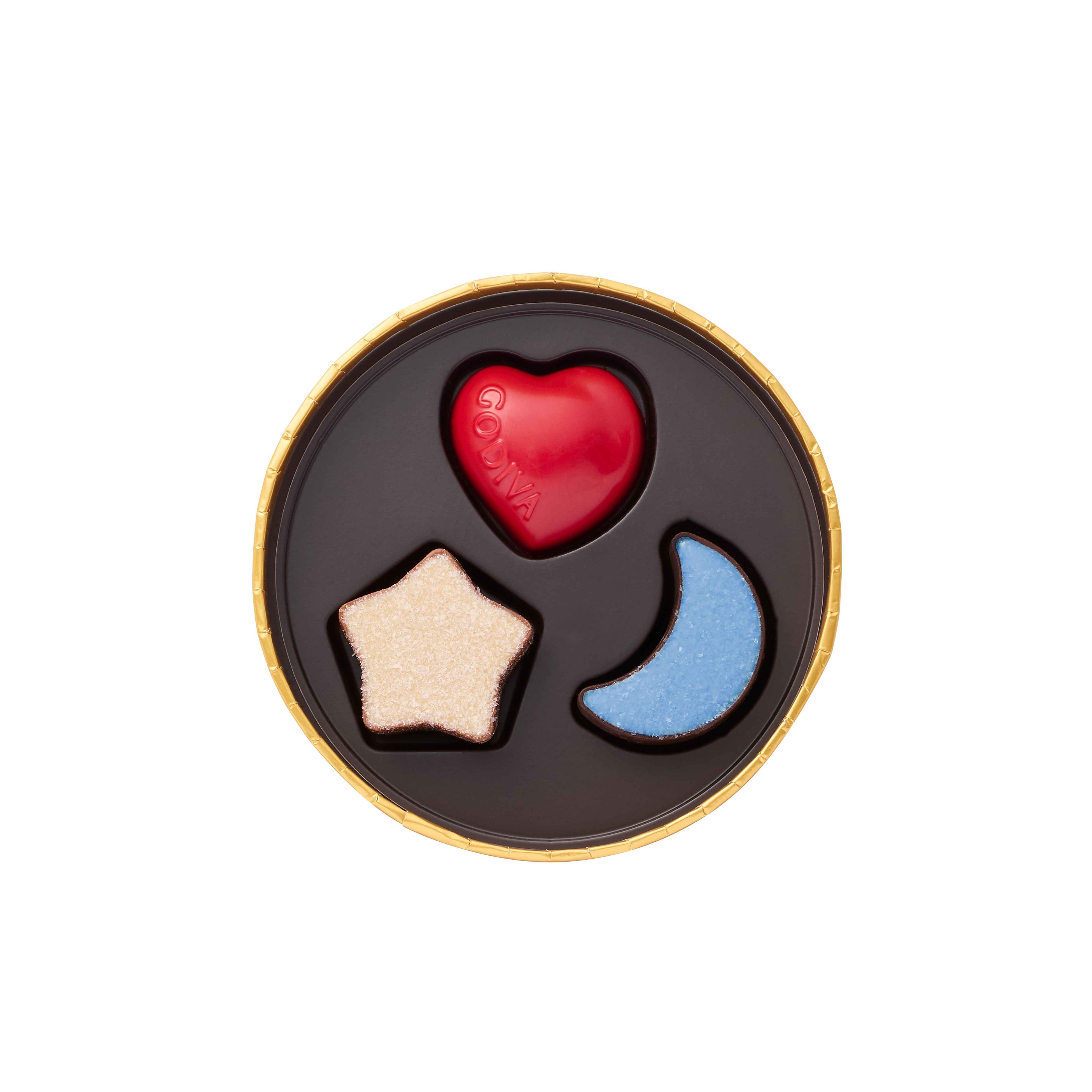 コレクションには、バニラ香るホワイトクッキークランブルムースに香ばしいアーモンドプラリネを重ねた月の形のチョコレートや、ダークキャラメルガナッシュのなつかしいバニラの甘い香りと塩キャラメルのほろ苦い甘みの星の形のチョコレートなどの限定チョコレートを詰め合わせました。月の形のチョコレートの色は、パッケージをあけてからのお楽しみとなっており、「ブルームーン」は、幸運の印です。