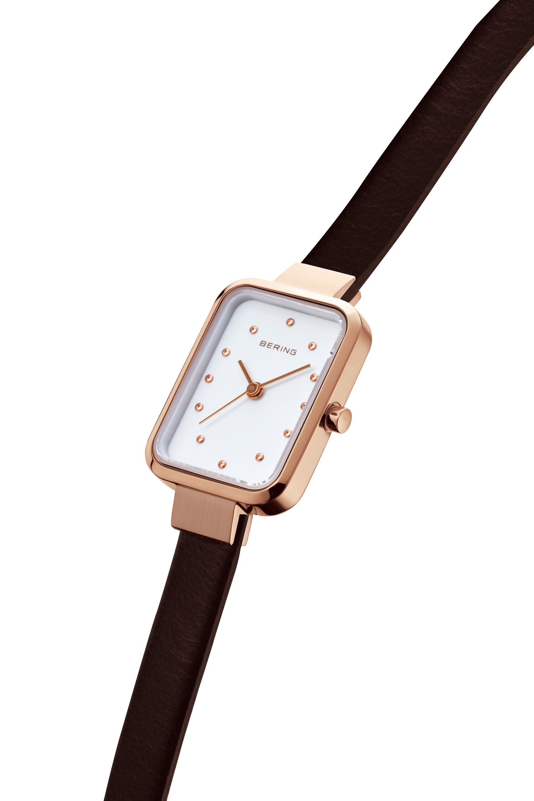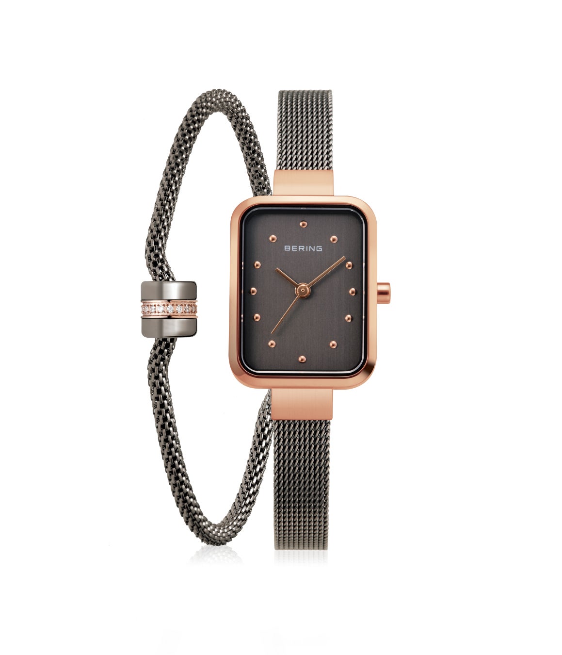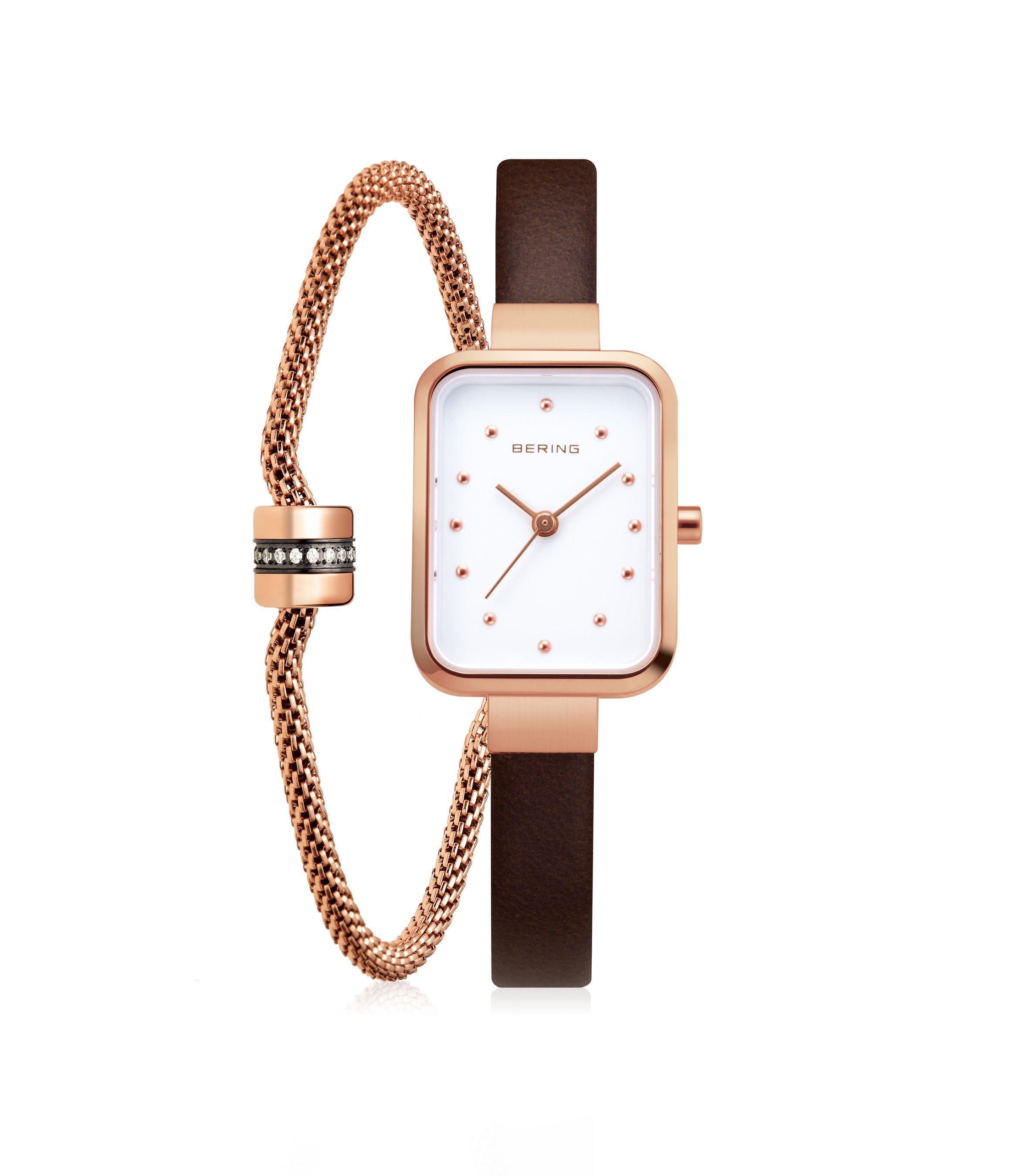 BERINGの豊富な商品バリエーションの中からオッジェンヌが選んだのは、シンプルでクラシックなスクエアの腕時計。細めのストラップが手首周りを華奢に演出してくれます。それぞれの腕時計には、時計と同系色のブレスレットが付属します。