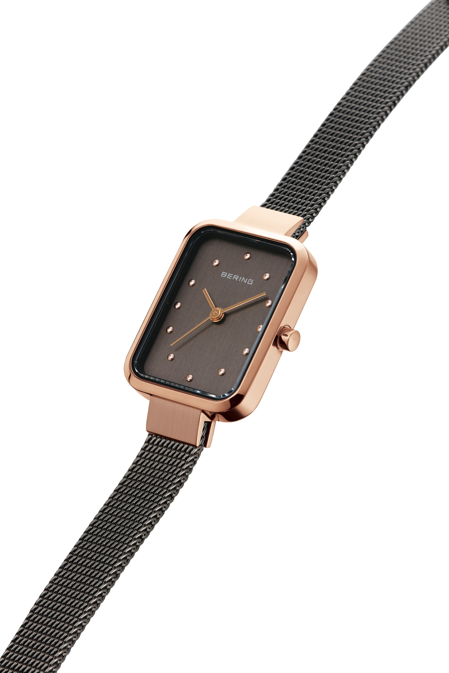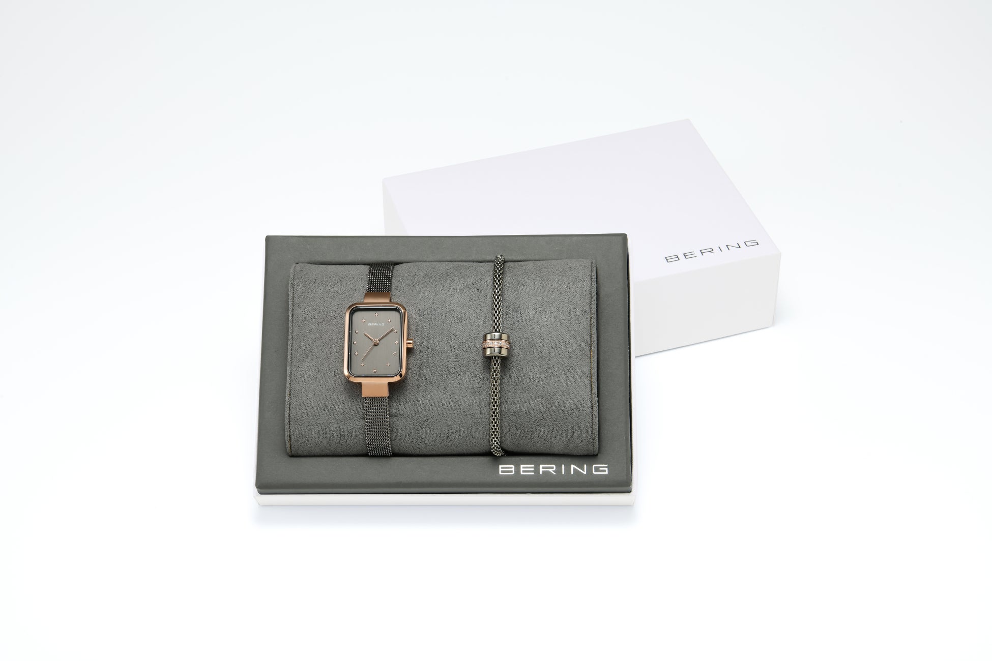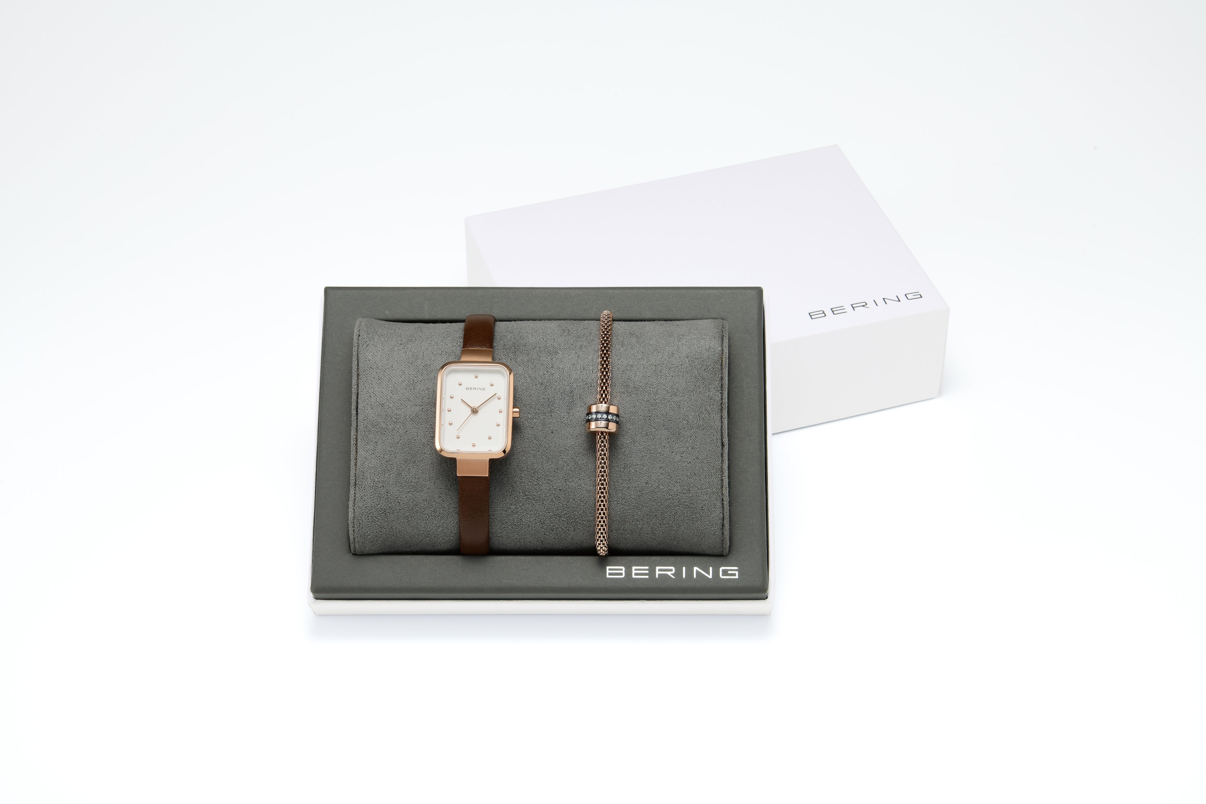 BERINGの豊富な商品バリエーションの中からオッジェンヌが選んだのは、シンプルでクラシックなスクエアの腕時計。細めのストラップが手首周りを華奢に演出してくれます。それぞれの腕時計には、時計と同系色のブレスレットが付属します。