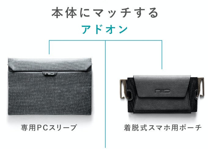 毎日に寄り添うことを目的として開発された【CACHE】は、機能性に優れ使い勝手が抜群。スマホ用ポーチ、小物用コンパートメント、スリングストラップを標準装備しており、オプションのPCコンパートメントは15インチのパソコンまで対応できます。