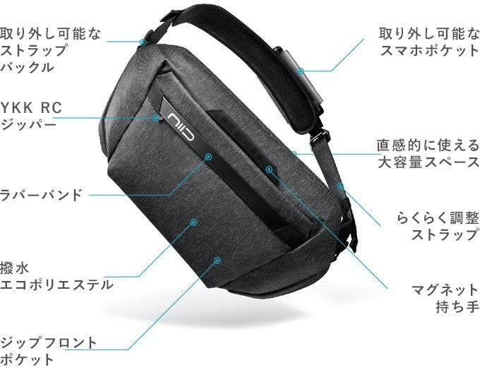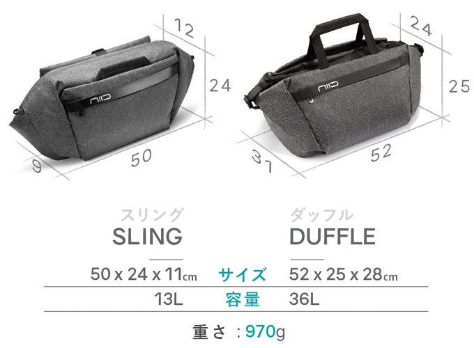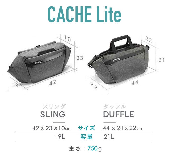 【CACHE】(キャッシュ)は、優れた機能性とデザイン性で知られるバッグメーカー「NIID」発の「スリングバッグ&ダッフルバッグ兼用2wayバッグ」です。拡張時の最大容量は36Lで、傘や水筒などの小物類から15インチ以下のPCまでばっちり収納できます。 防水仕様のため、雨天時や水辺での活動にも安心です。さらに豊富なオプションアクセサリーを取り揃えており、お好みの形にカスタマイズを楽しめます。