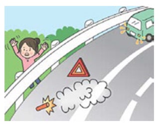 停車後は、ハザードランプを点灯するとともに発炎筒や停止表示板で後続車に、事故車や故障車の存在を知らせてください。道路上に留まらずに、通行車両に注意しながら速やかに〝ガードレールの外〟など安全な場所に避難してください。「110番」または「道路緊急ダイヤル#9910」もしくは「非常電話」にて通報してください。