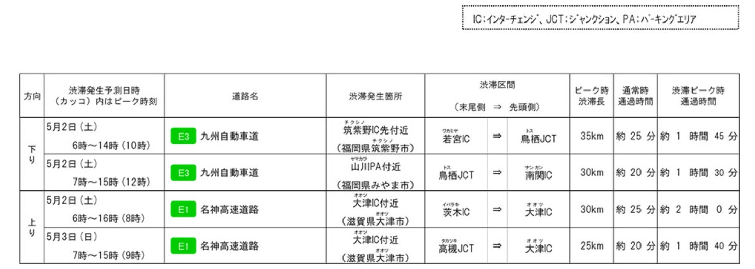 NEXCO西日本エリアのゴールデンウィーク期間における高速道路の渋滞予測