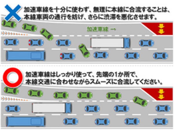 インターチェンジやジャンクション、サービスエリア・パーキングエリアなどから高速道路の本線に合流する箇所では、渋滞が発生しやすくなります。混雑時の合流部では加速車線を十分に活用し、先端の1か所で合流するファスナー合流へのご協力をお願いします。