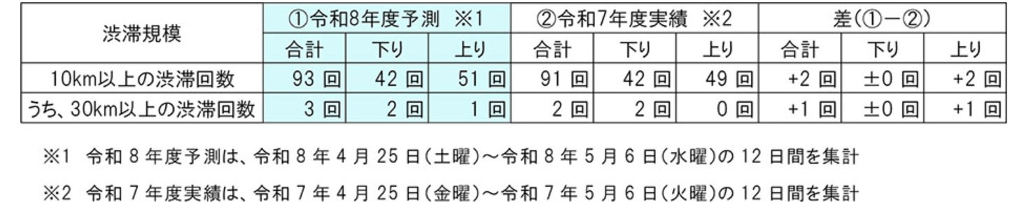 NEXCO西日本(大阪市北区、代表取締役社長:芝村善治)は、ゴールデンウィーク期間〔令和8年4月25日(土曜)~令和8年5月6日(水曜)の12日間〕の管内の高速道路における交通集中による10km以上の渋滞予測をとりまとめました。高速道路をご利用されるお客さまには、渋滞が多く予測される日や時間帯を前後にずらすなど渋滞を避けたご利用をお願いします。