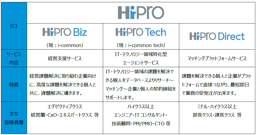 今回、複雑化する企業課題の解決支援を多角的に行うために、経営課題解決に取り組む企業向けに、事業会社やアカデミアで経験を積んだ上級役職者やテクノロジーに精通した専門家を、アドバイザーとして提案する経営支援サービス「i-common」、フリーランスITエンジニア専門のエージェントサービス「i-common tech」という既存の外部人材活用サービスを「HiPro」傘下へ集約。ブランド立ち上げと同時に発表した“企業と副業・フリーランス人材をつなぐマッチングプラットフォーム「HiPro Direct」”に加えて、これまで約10年の外部人材活用のサポート実績を持つ「i-common」、および「i-common tech」が加わることで、経営領域の高度な課題から、IT・テクノロジー領域における課題まで幅広く応えることを目指します。