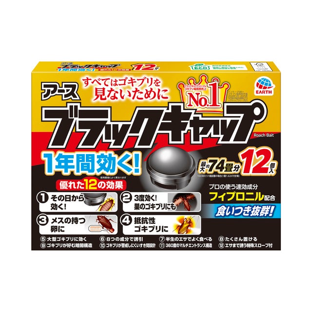 しかし、自社調査の結果、従来の黒い容器に対して「見た目が生活空間にあわない為、置きたくない。」と感じている方が21%にのぼることが判明しました。そこで当社は、より多くのお客様をゴキブリの不安から解放するため、デザイン性と機能性を両立させた『ブラックキャップ フィットタイプ』を発売いたします。2005年の発売以来、「すべてはゴキブリを見ないために。」を掲げて市場を牽引してきた『ブラックキャップ』。本製品もその高い信頼性を継承し、速効成分フィプロニル配合により、置いたその日から約1年間効果が持続します。薬剤抵抗性ゴキブリやメスの持つ卵、さらに巣に潜む仲間までまるごと退治する「12の効果」で、今後もお客様の安心で快適な暮らしをサポートしてまいります。