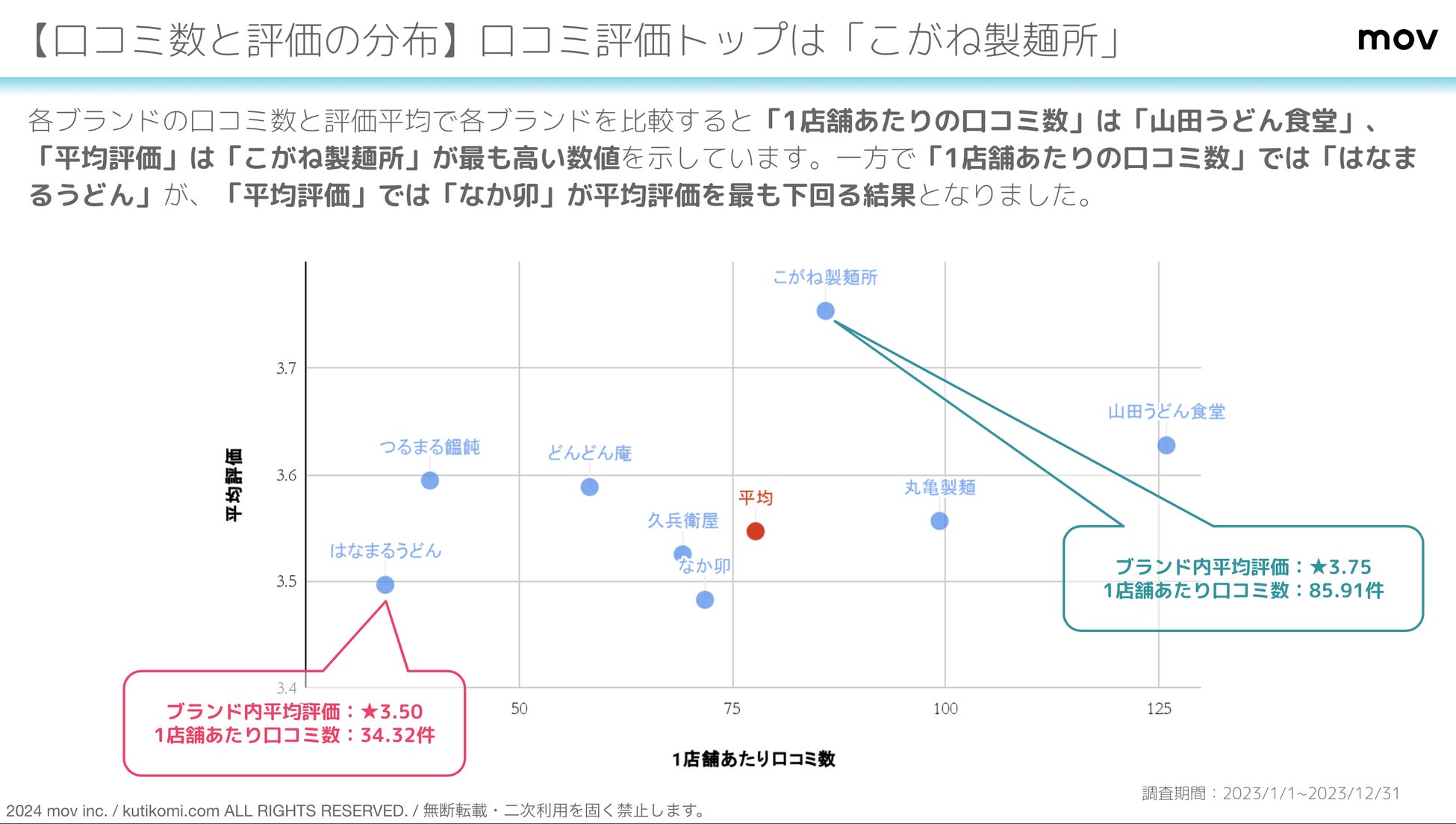 一方で「1店舗あたりの口コミ数」では「はなまるうどん」が、「平均評価」では「なか卯」が平均評価を最も下回る結果となりました。