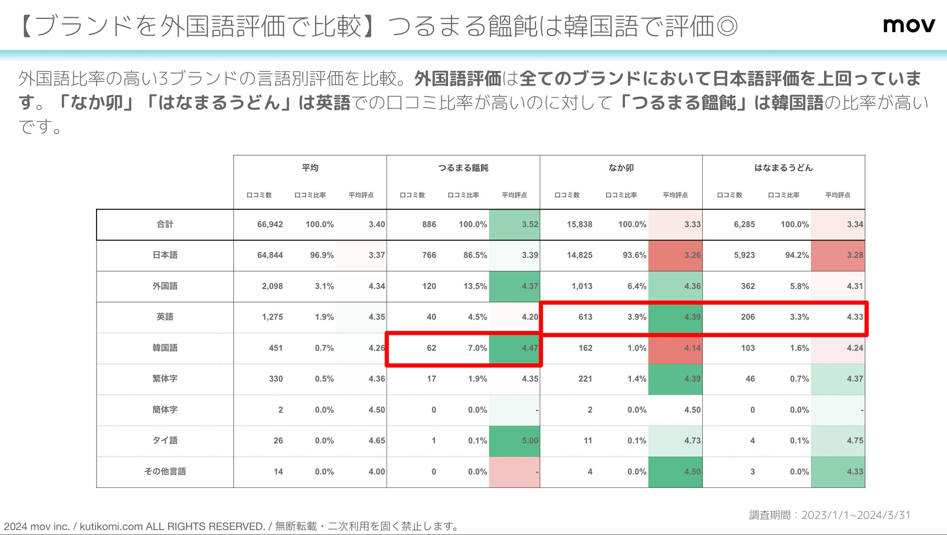 「なか卯」「はなまるうどん」は英語での口コミ比率が高いのに対して「つるまる饂飩」は韓国語の比率が高いことに加え、評価としても高い数値を示しています。