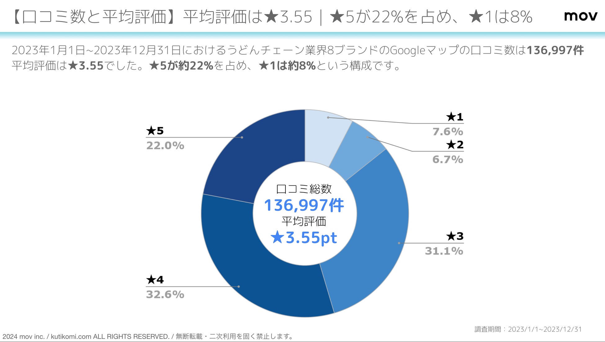 2023年1月1日~2023年12月31日におけるうどんチェーン業界8ブランドのGoogleマップの口コミ数は136,997件、平均評価は★3.55でした。★5が約22%を占め、★1は約8%という構成です。