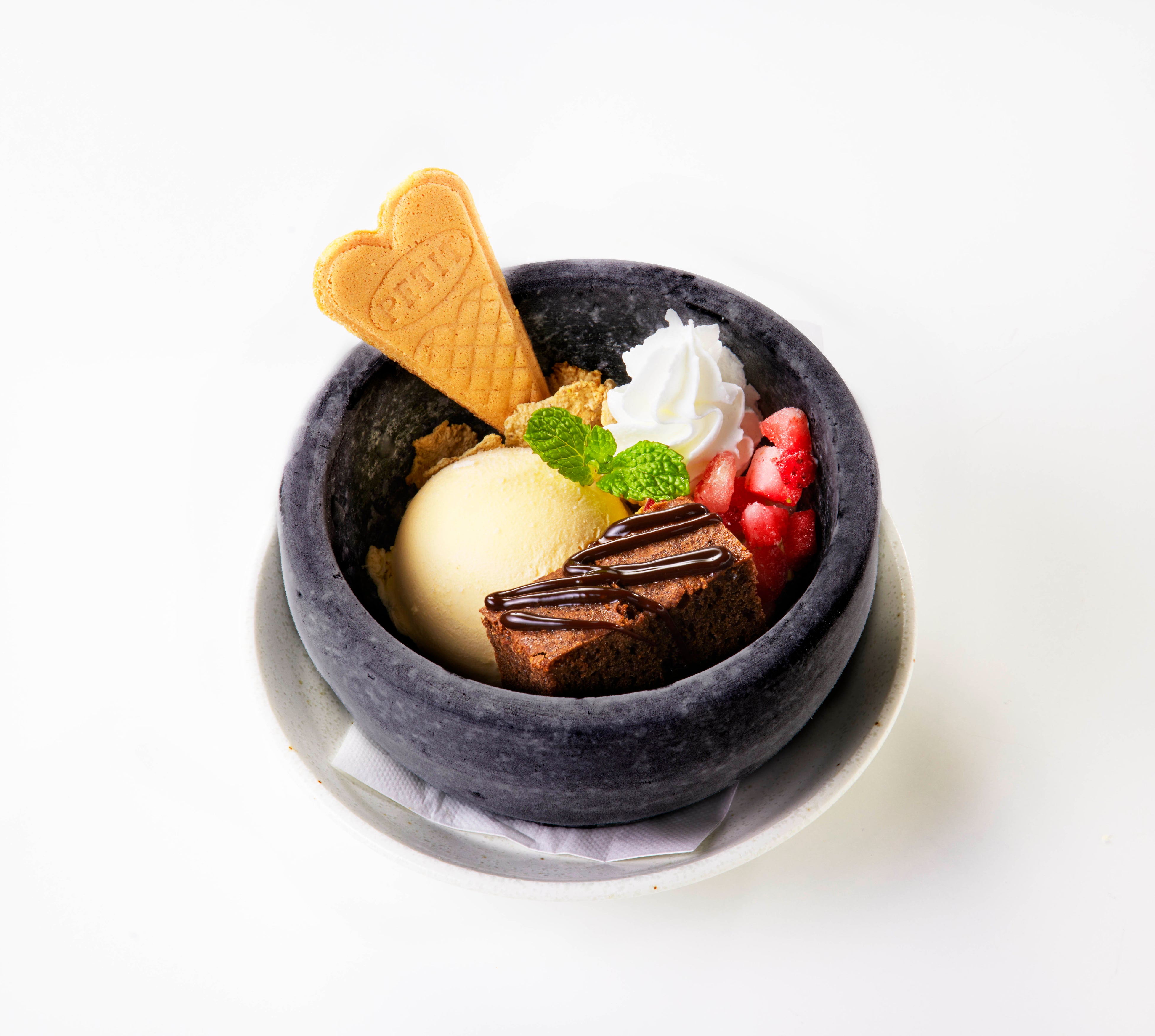ケークショコラに、フレーク、ダイスベリー、バニラアイスにホイップクリーム。美味しさと春らしく色彩豊かにご提供いたします。お肉の後の最後のお楽しみに是非、お召し上がりください。