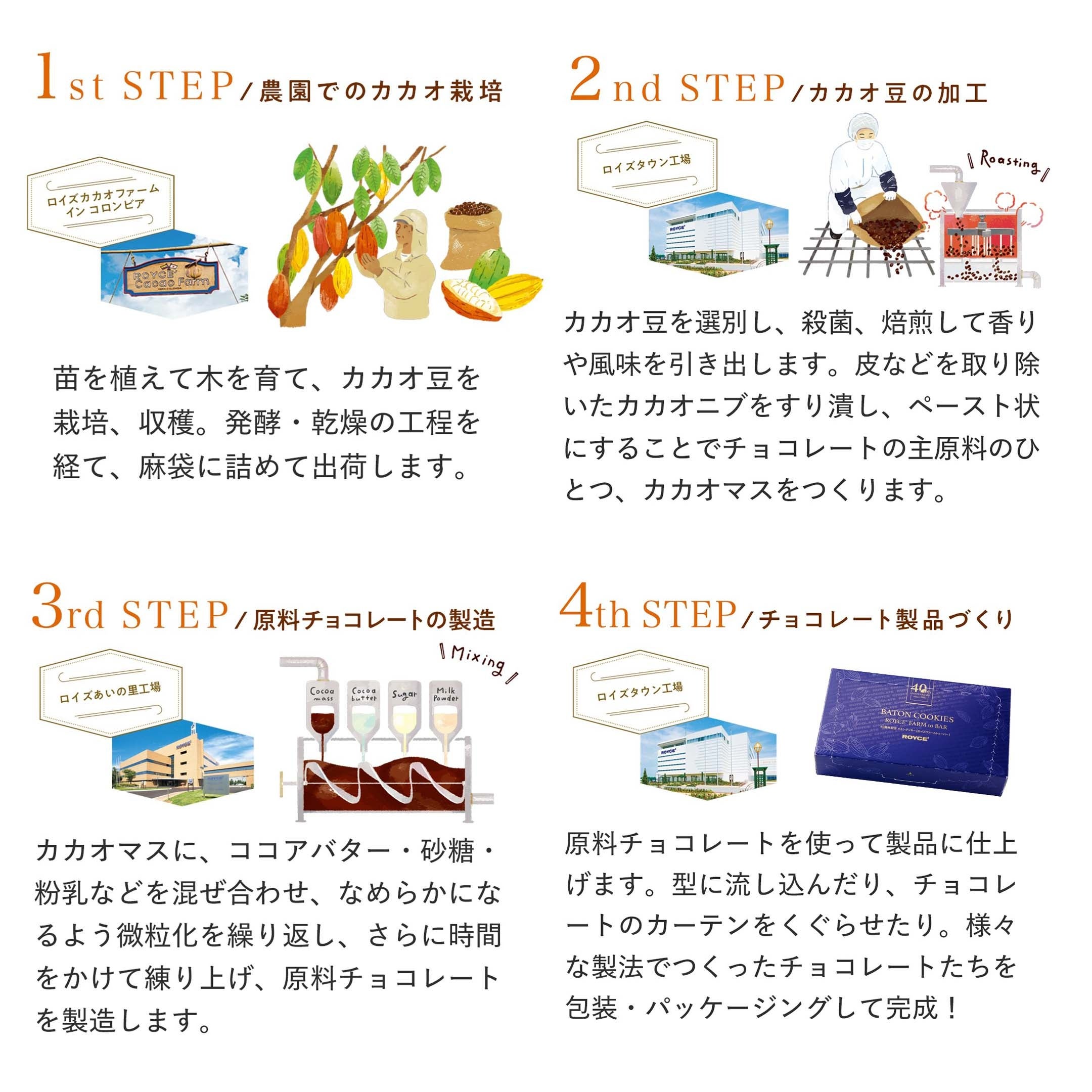 “チョコレートを、自分たちの手で育てたカカオ豆からつくりたい”。チョコレートメーカーとしての夢を叶えるべく、2014年に南米・コロンビアにカカオの自社農園を設立しました。創業40周年を迎えた2023年の夏には北海道・当別町のロイズタウン工場にカカオ豆加工プラントを新設し、自社農園で採れたカカオ豆を加工し製品にいたるまでのすべてを自社で一貫して手がける“ファームトゥーバー”のチョコレートが完成。長年夢見たロイズこだわりのチョコレートを、創業40周年記念の特別なパッケージでお届けしています。この“ファームトゥーバー”のチョコレート第五弾商品「40周年記念 バトンクッキー[ロイズファームトゥーバー]」を2024年2月15日よりロイズ通信販売・ロイズ直営店にて期間・数量限定で販売開始しました。