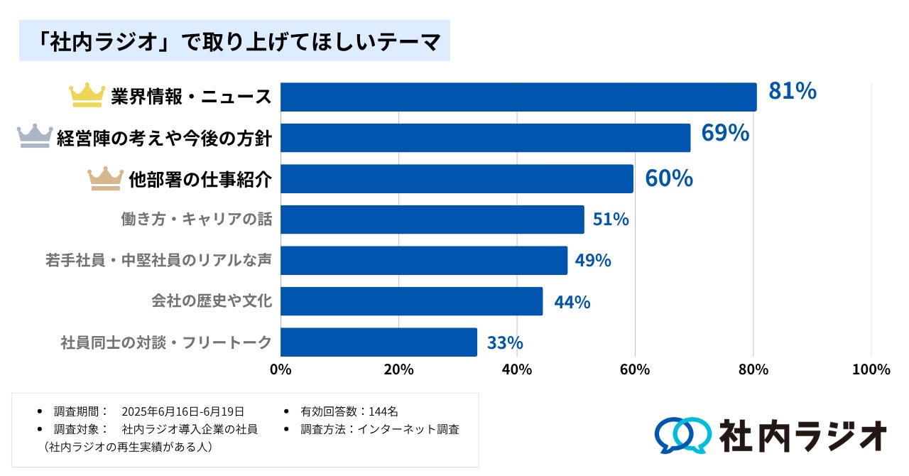 「今後も社内ラジオを続けてほしいか」という質問には、99%が「続けてほしい」と回答。また、社内ラジオで、取り上げてほしいテーマとしては以下のような内容が上位に挙げられました。