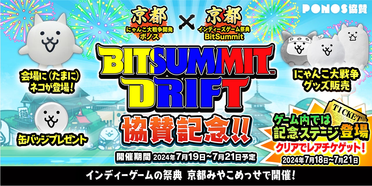 ポノス株式会社(本社:京都府京都市、代表取締役:辻子依旦、以下「ポノス」)は7月19日(金)~7月21日(日)に京都市勧業館「みやこめっせ」で開催される「BitSummit Drift」への協賛出展を記念して、「にゃんこ大戦争」にて、期間限定イベント を開始いたしましたので、これをお知らせいたします。