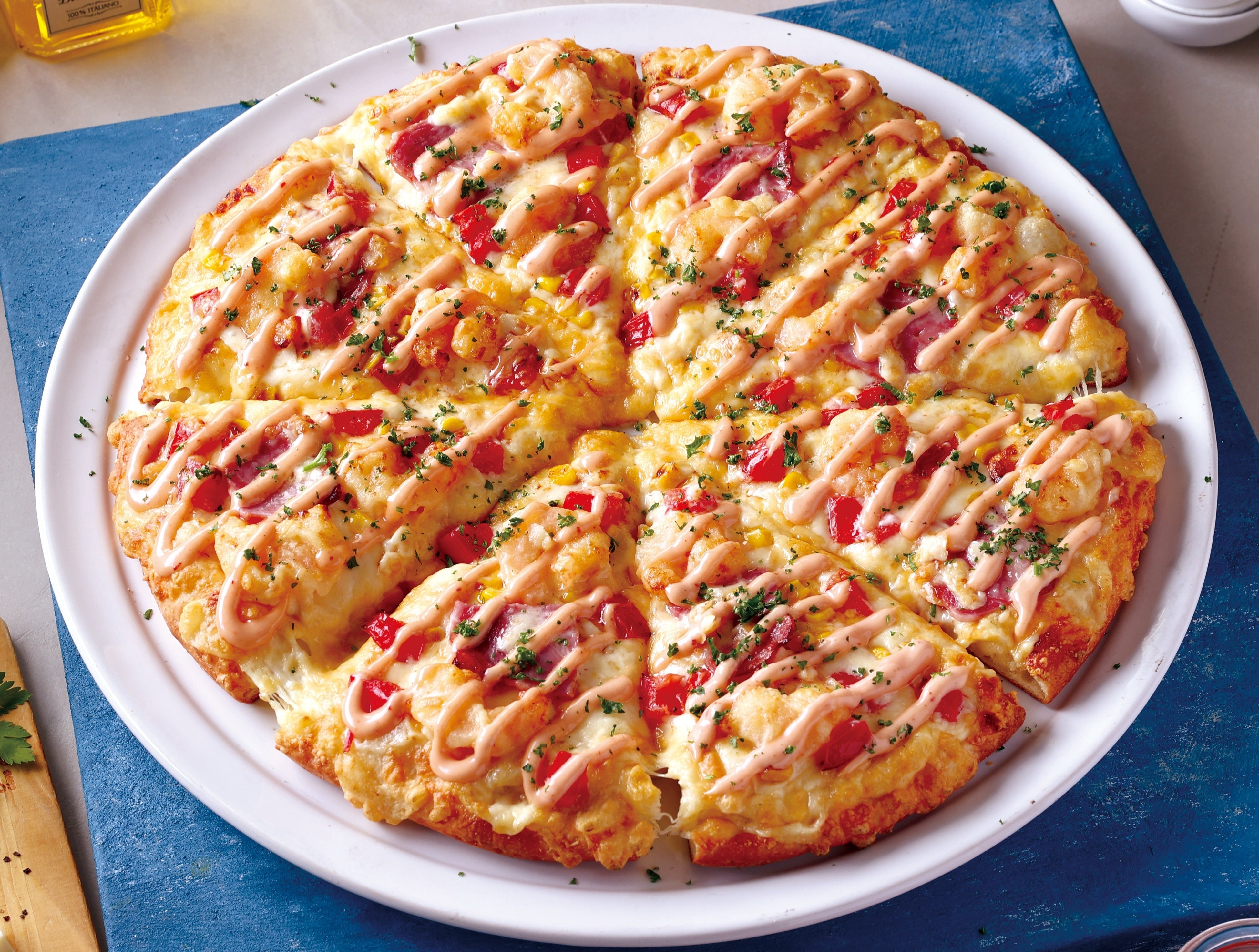 <2002年発売>ふっくらとした衣で包んだプリプリのエビに特製オーロラソースを合わせた、あの定番の美味しさ。お子様から大人まで幅広く愛される、毎年人気の期間限定ピザ。