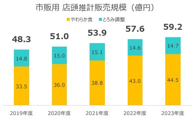 UDF市場は年々伸長し、2023年度の販売規模は59億円(やわらか食:44.5億円、とろみ調整14.7億円)で前年比103%、2019年比では122%となりました。日本介護食品協会が定めた自主規格の4区分ととろみ調整では、「かまなくてよい」が21億円と最も大きい市場になっています(インテージSRI+より)。