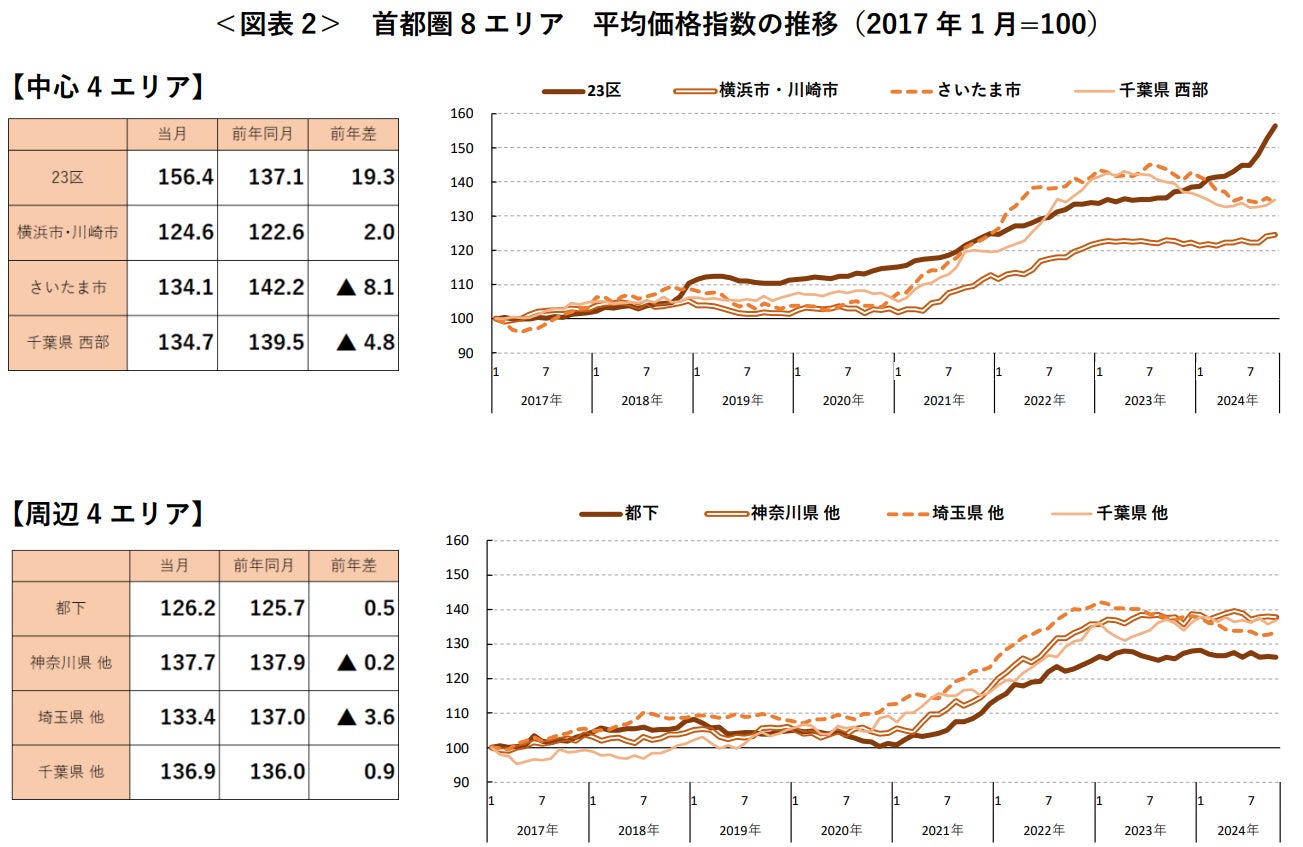 ●東京23区、横浜市・川崎市は2017年1月以降最高額を更新。中でも東京23区の上昇が目立ち、前年同月比は+14.0%と調査開始以来最高の上昇率。