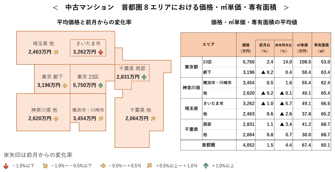 首都圏の1戸あたり平均価格は、前月比、前年同月比ともに3カ月連続で上昇し、2017年1月の調査開始以来初の4,000万円台となった。