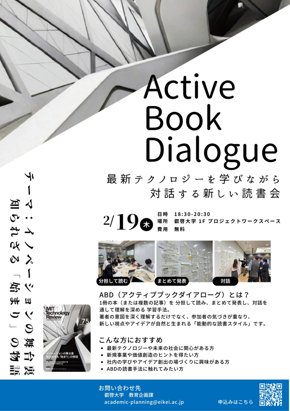 叡啓大学(学長:有信睦弘、広島市中区)は、2026年2月19日(木)、叡啓大学プロジェクトワークスペースにて、 最新テクノロジーを学びながら対話する読書会「ABD(アクティブブックダイアローグ)by Eikei Project Work Space」を開催します。