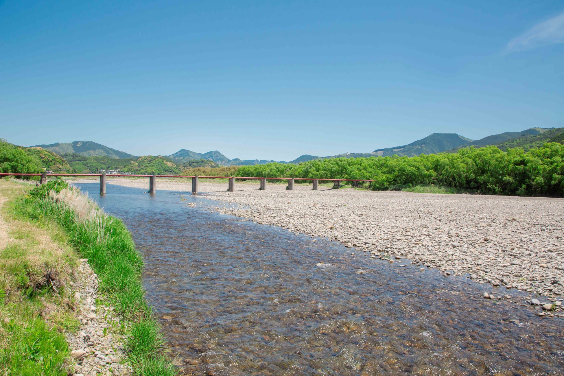 透き通った水がさらさらと流れる富田川に掛かる潜水橋。背後に広がる緑の山々を借景に、青い空を写し、太陽の光を受けてキラキラと光る水面が織りなす一幅の絵のような風景に癒されることでしょう。