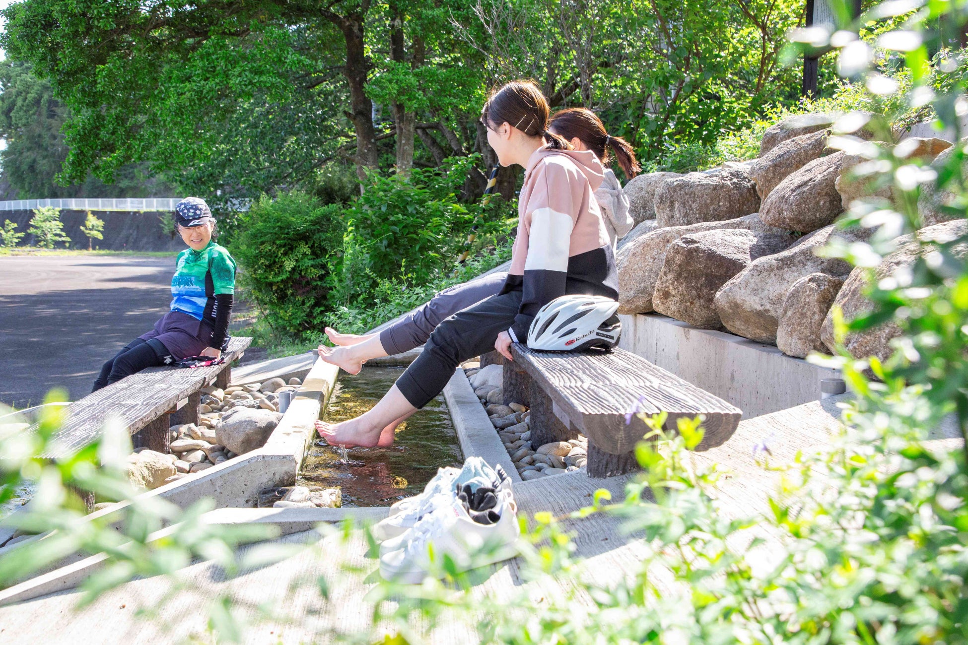 最後に訪れる稲葉根王子の前には「水垢離場(みずごりば)」があります。「水垢離」とは熊野古道の参詣時に富田川で行われていた清めの儀式。水を浴び、身体の穢れを払い身を清めることで、今までの罪がことごとく消え去ると信じられていました。現在は足をつけて水垢離を体験できる場所が用意されています。「水垢離」という神聖な習わしの一部を体験した後は、瀬戸さんやガイドの方々と季節のお菓子でひと休み。雄大な自然や歴史を間近に感じながら語らう時間がこのツアーの醍醐味です。