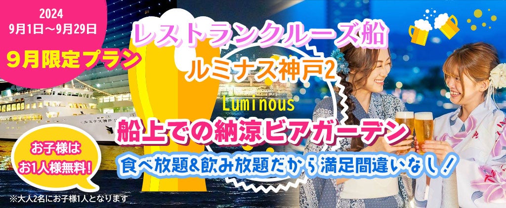 9月限定プランお一人様¥7,500-《大人2名で子供1名無料》ルミナス神戸2 5つの時間帯より選べて、仕事帰りにも行きやすい♪【船上での食べ放題&飲み放題の2時間制「納涼ビアガーデン」】