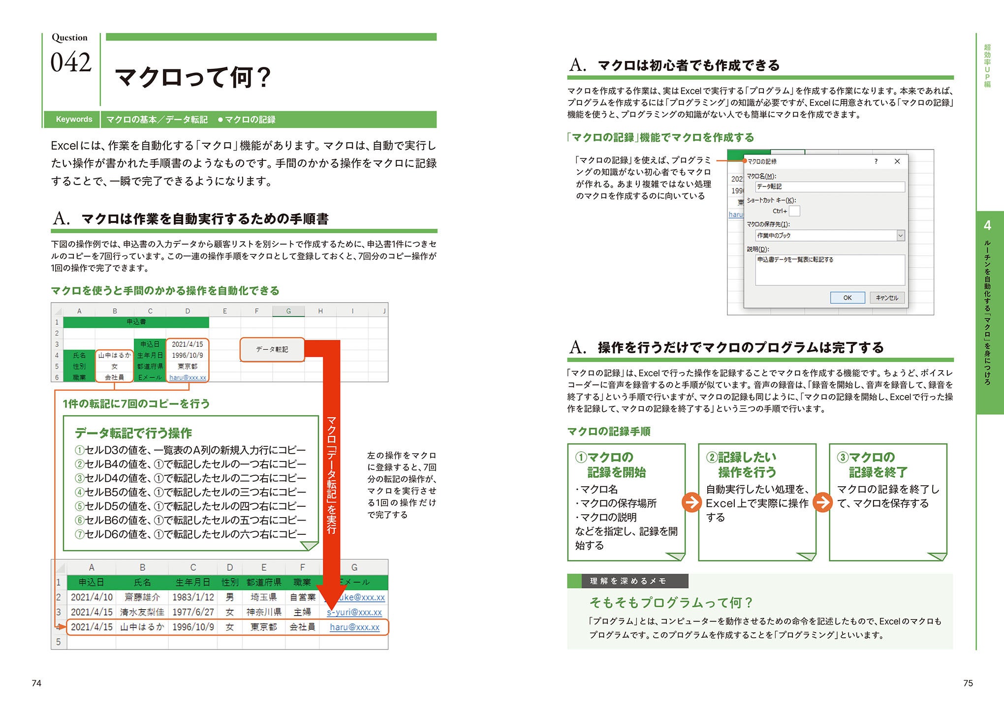 さらに、マクロやピボットテーブルといった一歩進んだ機能の使い方まで、わかりやすく説明しています。