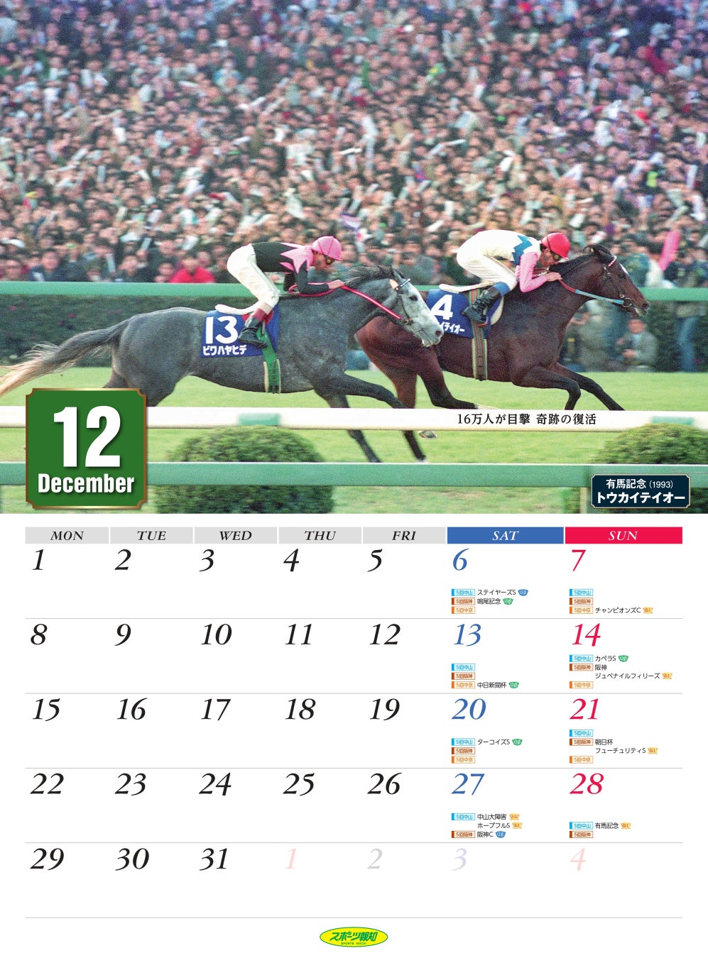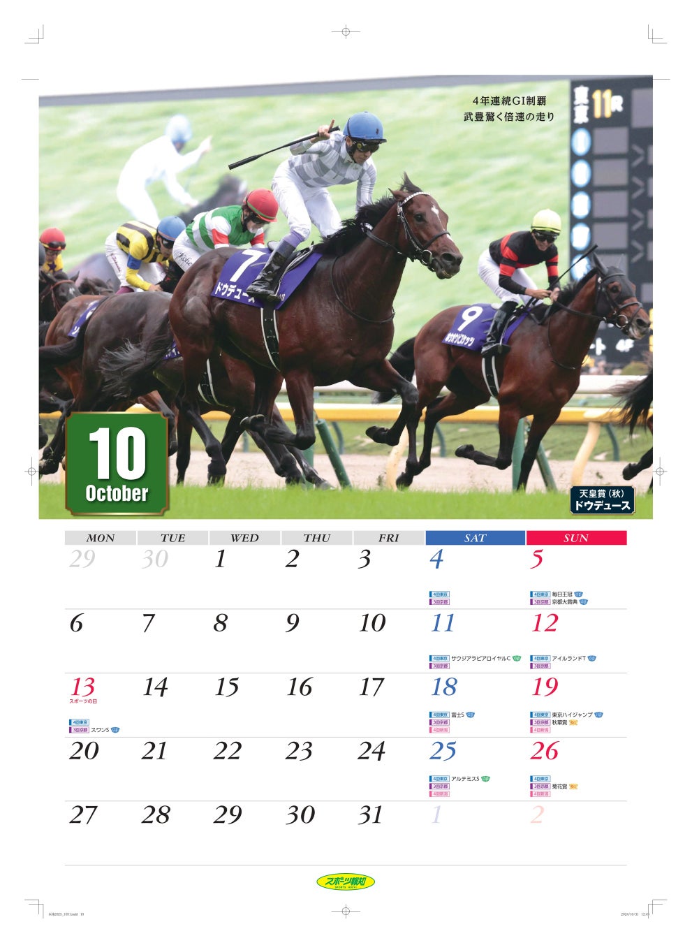 スポーツ報知を発行する株式会社報知新聞社(代表取締役社長・依田裕彦)は、「報知競馬カレンダー2025」を12月7日(土)から順次発売致します。表紙は、ダービーを制したダノンデサイルから軽快に笑顔で飛びおりる横山典弘騎手。1月はフォーエバーヤング、2月はペプチドナイル、3月はステレンボッシュ…12月はトウカイテイオーと、毎月12か月違った馬が登場します。さらに2025年の中央競馬開催全日程と、重賞競走の日程が記載。暦は月曜で始まり、週末の土・日で終わるため、競馬ファンが開催レースを確認出来る見やすさ抜群。競馬ファンには便利なカレンダーになっております。
