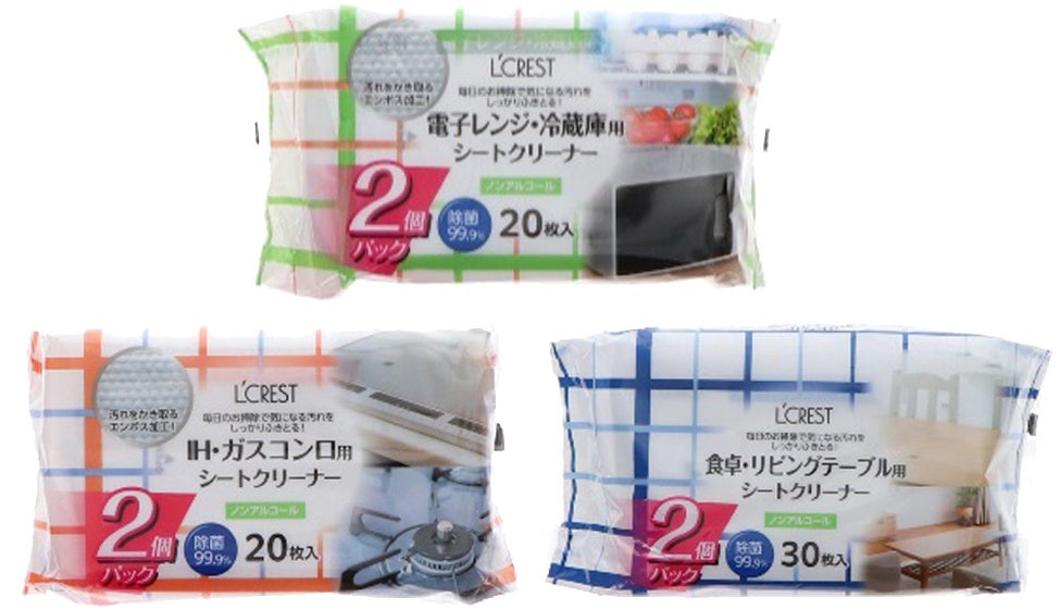拭くだけで簡単に掃除ができるシートクリーナーがデビューしました。「電子レンジ・冷蔵庫用」「IH・ガスコンロ用」「食卓・リビングテーブル用」の3種類で、使用場所に合わせて異なる成分が配合されています。それぞれ2パックで198円と手ごろな価格にもこだわりました。