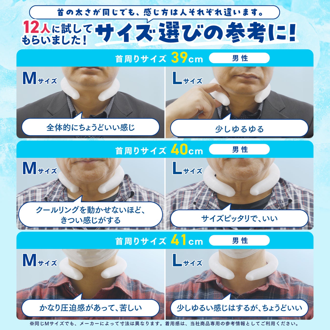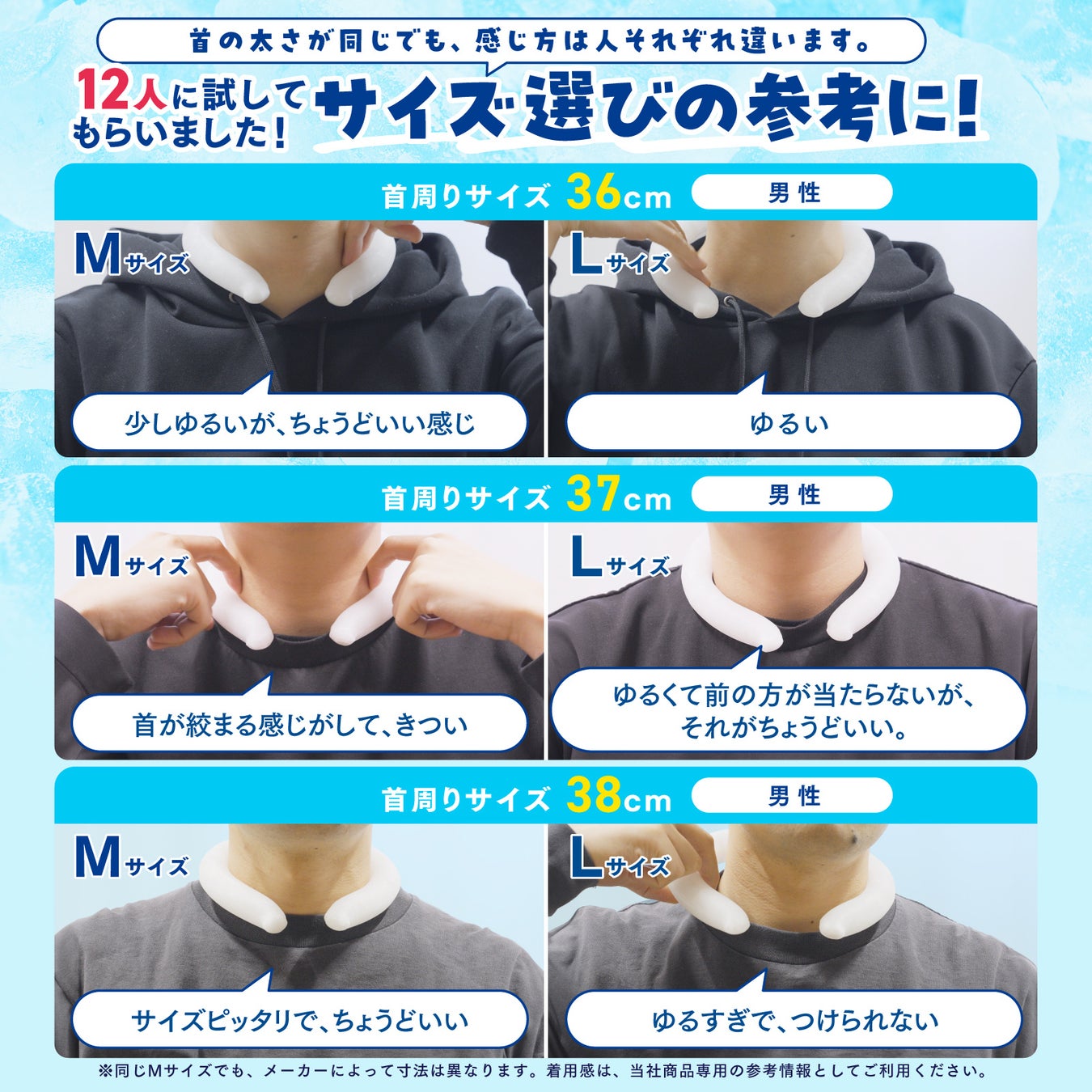 首元ひんやり君(クールネックリング)の中で、最も人気があるのはLサイズです。Lサイズは男性にも使いやすい大きめサイズで、広い首回りをしっかり冷却できるため、特に男性のお客様から多くの支持をいただいています。サイズ選びの際も、Lサイズを選ばれる方が圧倒的に多く、暑さ対策として最適なサイズとなっています。