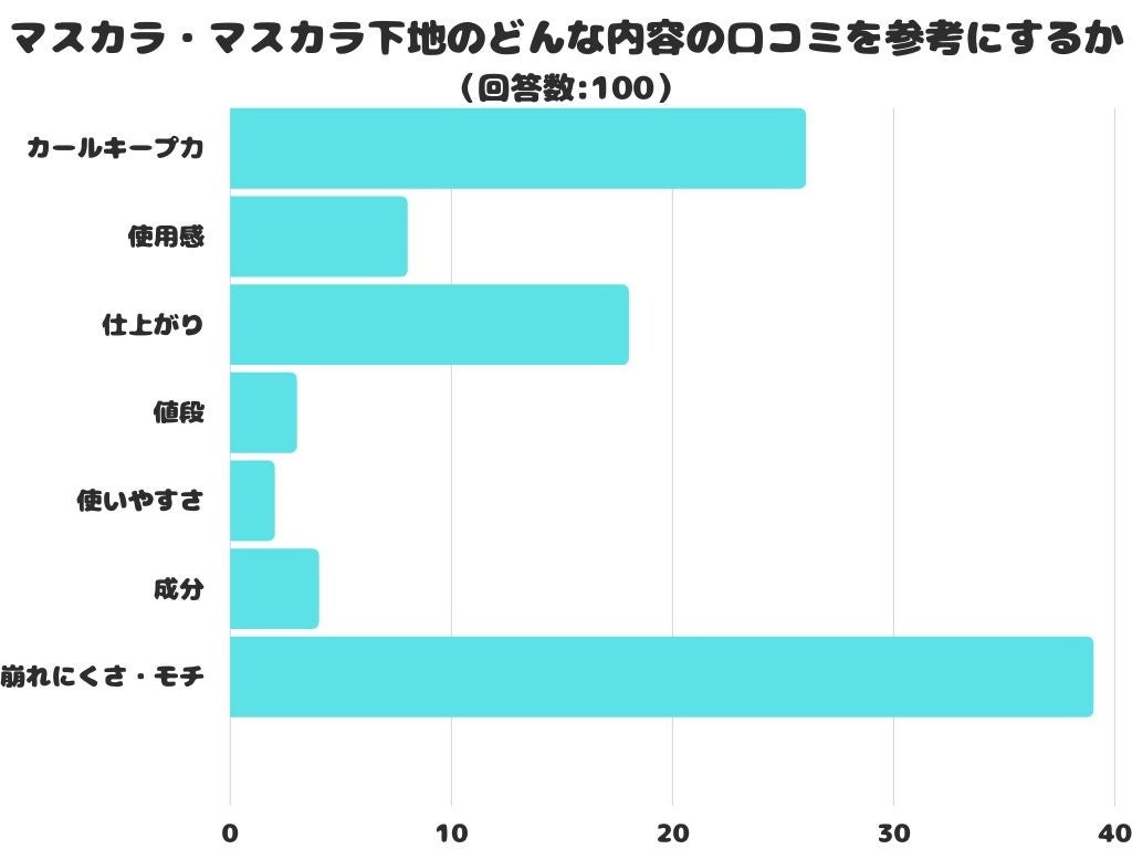 マスカラ・マスカラ下地のどんな内容の口コミを参考にするかをアンケートにて調査したところ、1位は「崩れにくさ・モチ」でした。