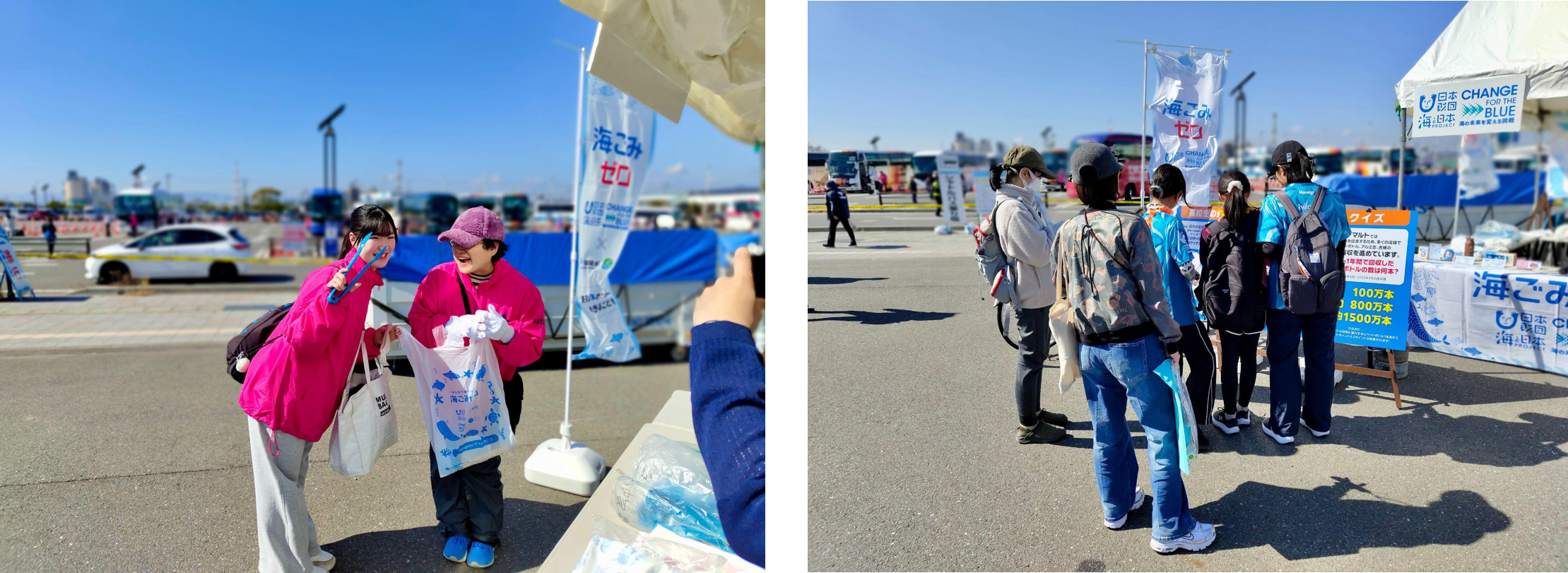 海洋ごみに関するクイズやパネルでの事例紹介、ごみ袋とトングを配布しごみ拾い体験も実施しました。ランナーだけでなく、応援する家族や子ども達にも大会を通じて海洋ごみ問題を“自分ごと”として考えるきっかけを作ることができました。