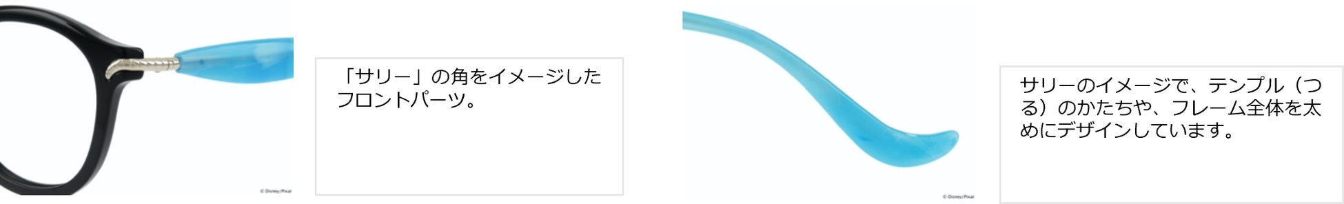 テンプル(つる)のかたちや、フレーム全体を太めに仕立てることで、「サリー」の特徴的なしっぽや大きな体を表現しました。
