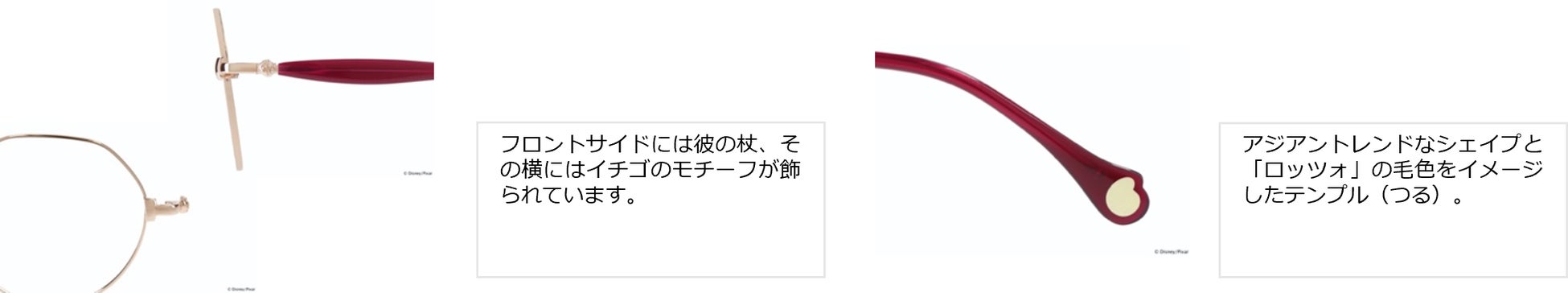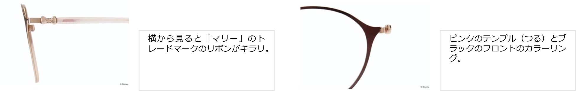 横から見ると「マリー」のトレードマークのリボンがキラリ。ピンクのテンプル(つる)とブラックのフロントのカラーリングなど、彼女が持つ小さなレディーのイメージを、メガネ全体で表現しました。