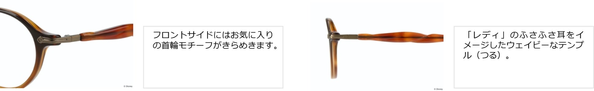 「レディ」のふさふさ⽿をイメージしたウェイビーなテンプル(つる)。フロントサイドにはお気に入りの首輪モチーフがきらめきます。普段使いしやすい上品なブラウンカラーもポイント。