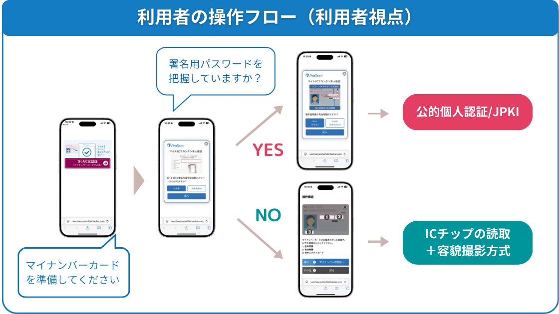 こうした課題を解消するため、オンライン本人確認ツール「ProTech ID Checker」はユーザーの利用環境や状況に応じて最適な認証方法を自動で案内する新機能「ぴったりIC認証ナビ」を追加しました。これにより、利用者は迷うことなくスムーズに本人確認を完了でき、途中離脱の低減が期待できます。