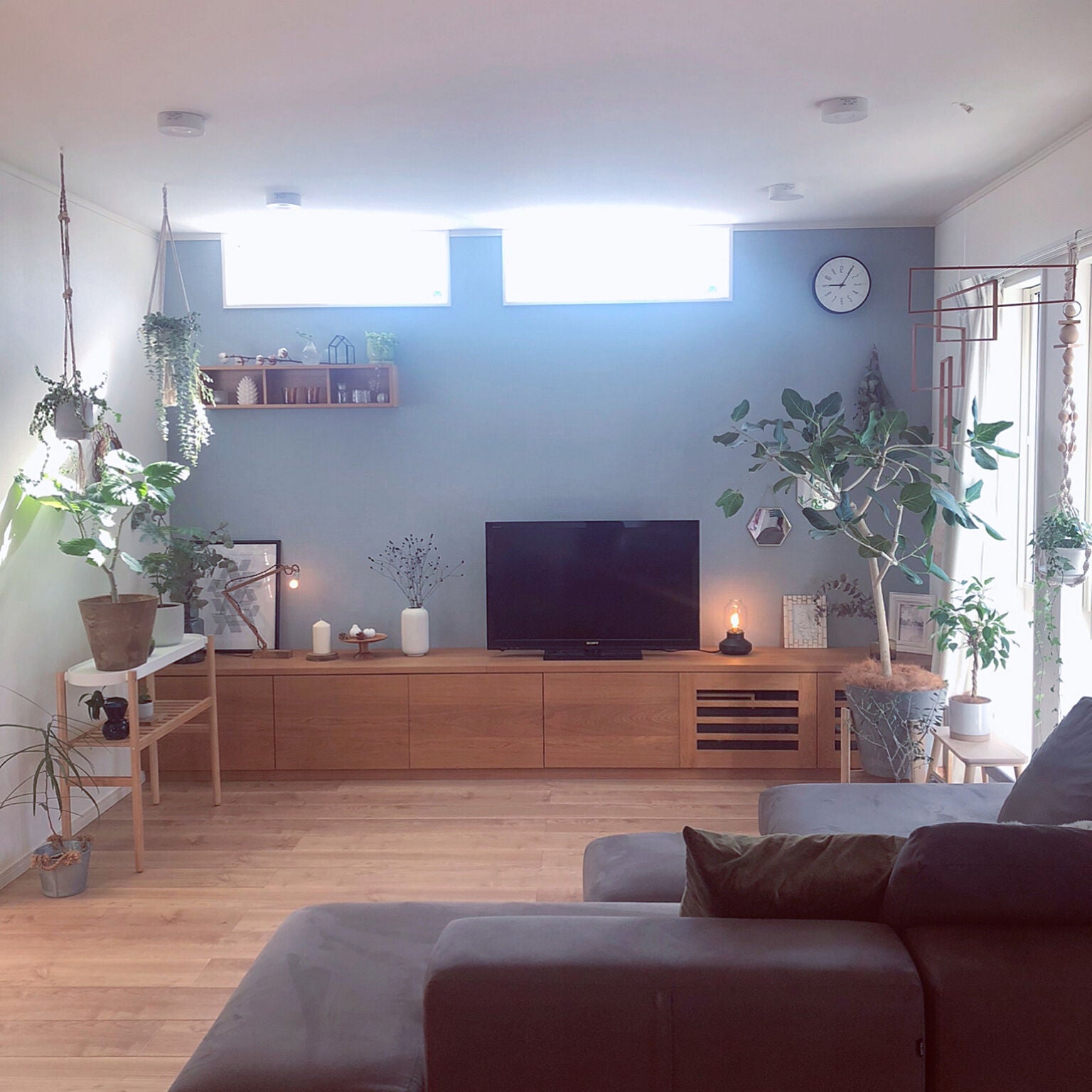 植物と小物がバランスよくコーディネートされ、上品で清潔感のある北欧インテリアです。窓から差し込む光が空間を明るく演出し、緑に囲まれたライフスタイルを楽しんでいますね。