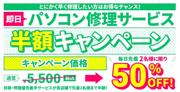 OSのアップグレードやPCの買い替えを特別価格でサポート。処理速度アップに効果的なHDD→SSDへの交換も可能です。また、キャンペーン期間中の対象店舗にて、毎日2名限定で最短即日修理「プライオリティサービス」を半額で承るキャンペーンも実施。「なるべく早く修理したい」「PCを毎日使うため修理の機会を逃していた」というお客様にご活用いただきたいチャンスです。