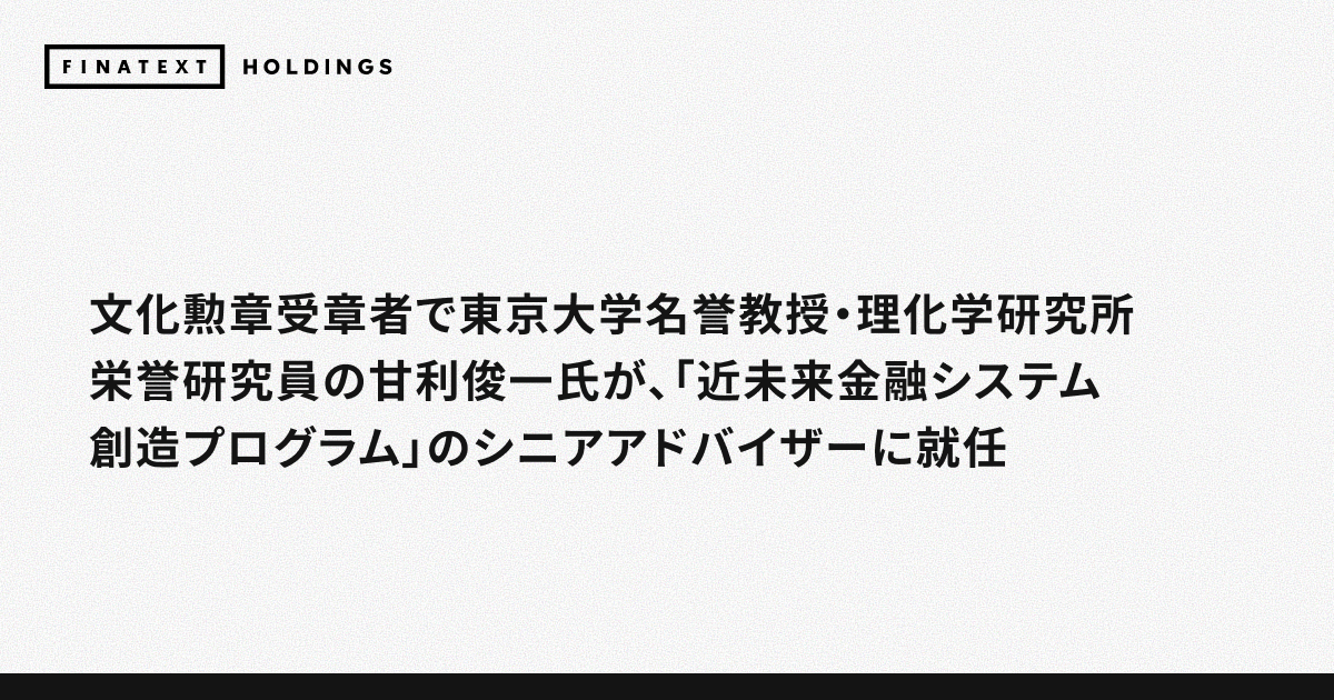 次世代金融インフラの提供を通して組込型金融を実現する株式会社Finatextホールディングス(本社:東京都千代田区、代表取締役社長CEO:林 良太、以下「Finatextホールディングス」)は、近未来の金融システムを創る中核人材の育成を目的として2017年から開講している「近未来金融システム創造プログラム」のシニアアドバイザーに、甘利俊一氏(文化勲章受章、東京大学名誉教授、理化学研究所栄誉研究員)が就任したことをお知らせします。