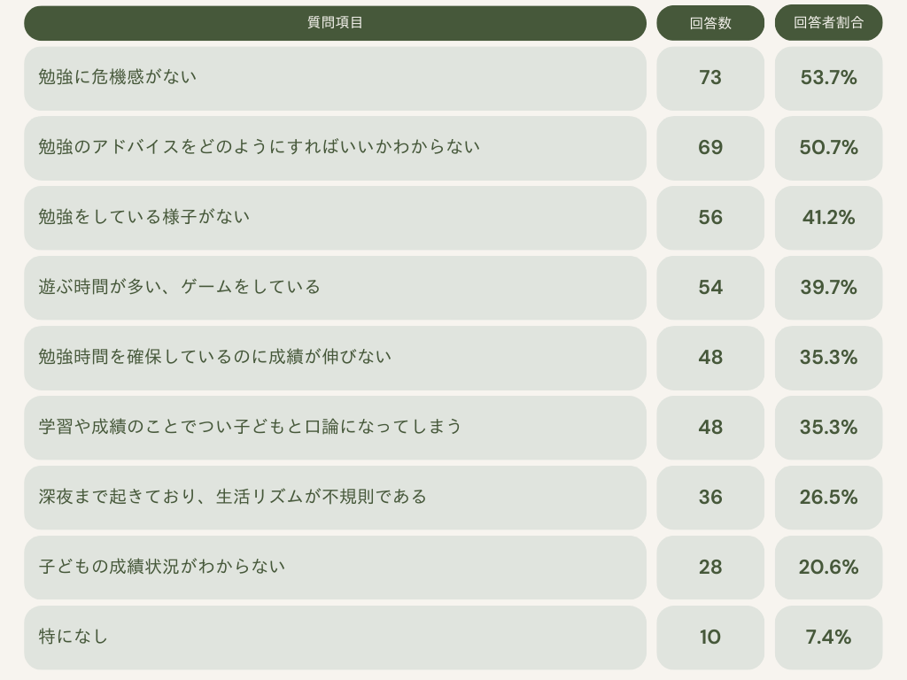 その一方で、家庭での自主学習に関する悩みでは、「勉強に危機感がない」「勉強のアドバイスをどのようにすればいいかわからない」「学習や成績のことでついお子さまと口論になってしまう」など、保護者と子どもの間で学習に関してコミュニケーションが適切に取れないことに起因する課題が多いことがわかりました。