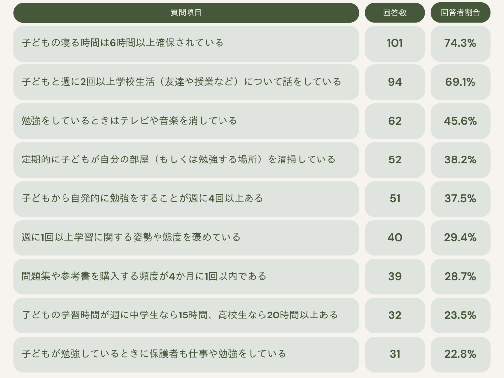 今回のアンケート結果から、保護者が家庭での学習環境を良くするために、さまざまなことをすでに実行していることがわかりました。