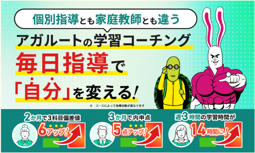 アガルートアカデミーは現在50以上の資格試験対策講座を展開しており、数多くの合格者を世に送り出していますが、その膨大な学習記録を分析していくと、合格者の「学習への取り組み方」にはいくつかの共通点があることがわかりました。彼らが共通して実践していた学習方法やモチベーションアップの工夫、確実に学習習慣知識を定着させる数多くのノウハウを、アガルートコーチングでは小中高生向けに、個人個人に合わせたオリジナルメソッドとしてご提供します。
