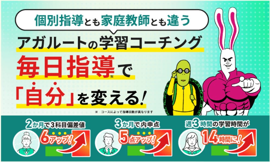 生徒の進路や学力は保護者の最大の関心事です。「勉強をしなさい」「宿題は終わった?」と確認するものの、 親子関係では甘えが生まれ、緊張感がないため、かえって生徒が学習を嫌いになったり、敵視されることも多いのが現状です。アガルートでは、生徒の学力や進捗に加えて、性格診断や生活習慣も加味しながら最適なコーチングを行います。そして、保護者様との定期面談において、ご家庭でも生徒に合ったコーチングを実践していただけるように手法を共有しつつ、連携を行います。アガルートのコーチ陣と一緒に生徒を成功へ導きましょう!