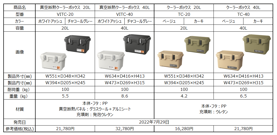 今回発売する「真空断熱クーラーボックス」と「クーラーボックス」はそれぞれ、コンパクトな20Lモデルと、2Lペットボトルを立てて収納可能な40Lモデルの2サイズを展開します。両タイプ共に保冷力が高く、特に全面に真空断熱パネルを使用した「真空断熱クーラーボックス」は、約40℃の環境下において20Lタイプで約40時間、40Lタイプで約55時間(※)保冷状態を保てるため、長時間のアウトドアシーンにも適しています。