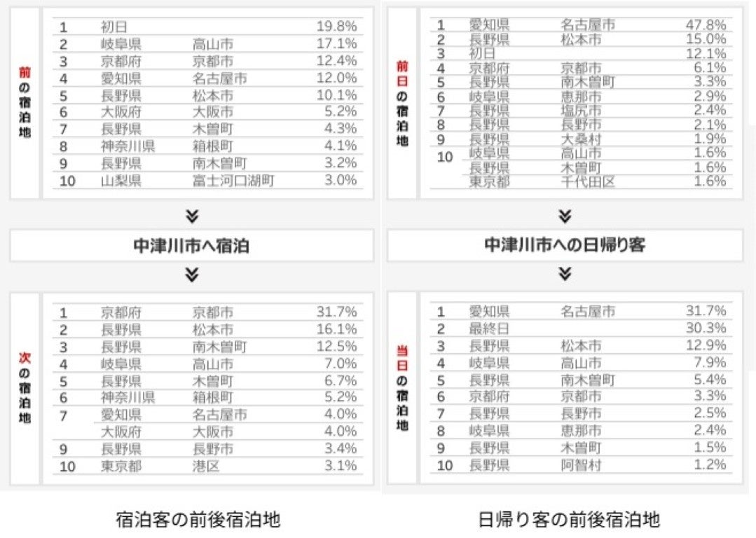 一方、中津川市を日帰りした観光客の前後の宿泊地は、前泊地・当日の宿泊地ともに名古屋市が1位になっています。