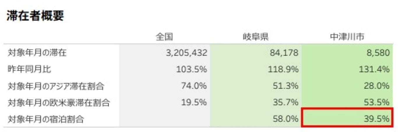 宿泊と日帰りの割合を知るために「市区町村サマリー」を活用し、2025年11月の岐阜県中津川市の宿泊率を確認したところ、39.5%(約4割)が宿泊していることが分かります。