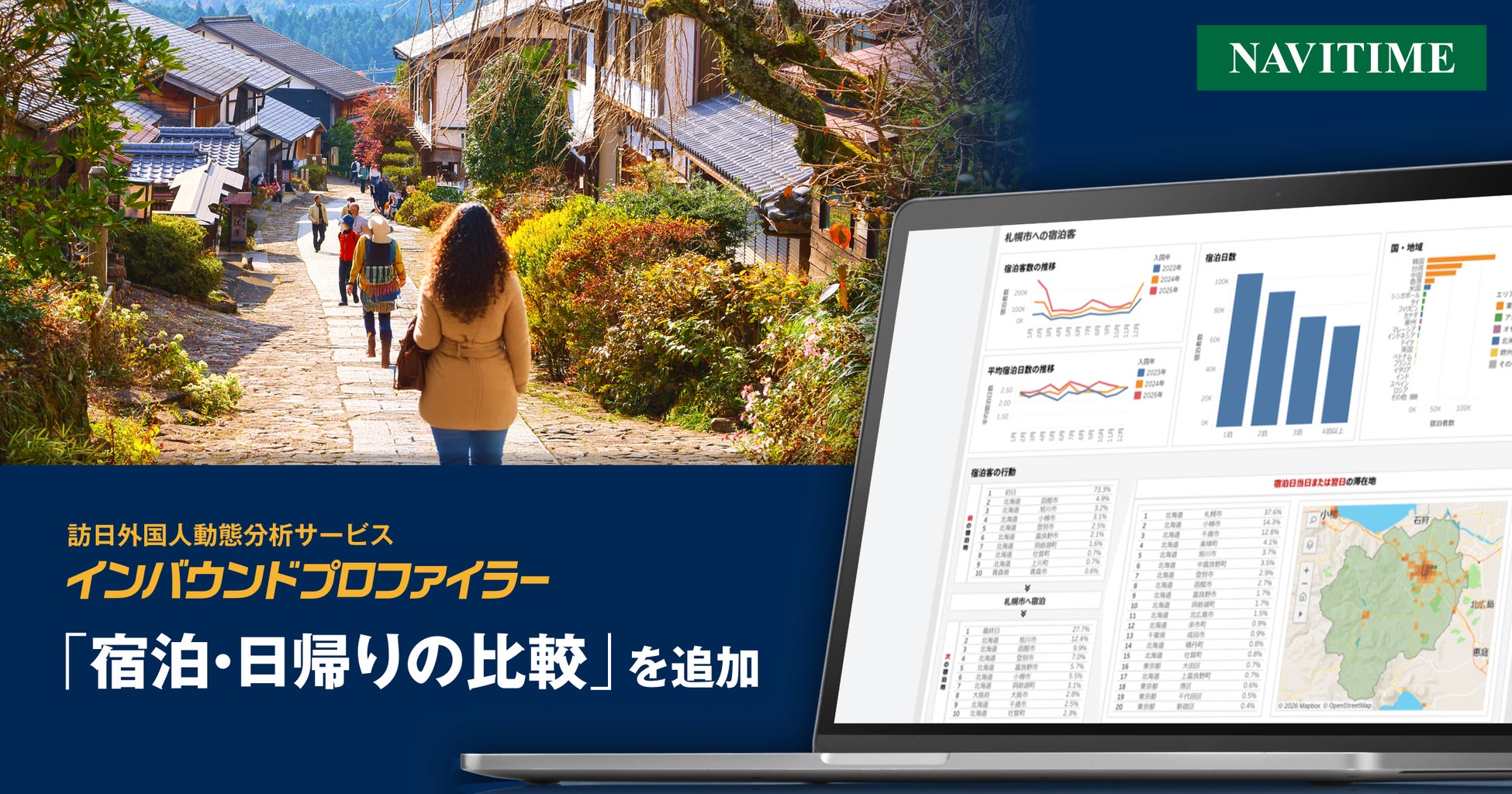 株式会社ナビタイムジャパン(代表取締役社長:大西 啓介、本社:東京都港区)は、2026年1月29日(木)より、訪日外国人動態分析サービス『インバウンドプロファイラー』において、インバウンドの宿泊実態を把握できる「宿泊・日帰りの比較」機能を追加します。