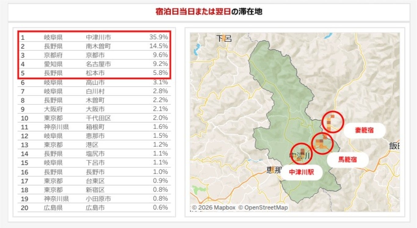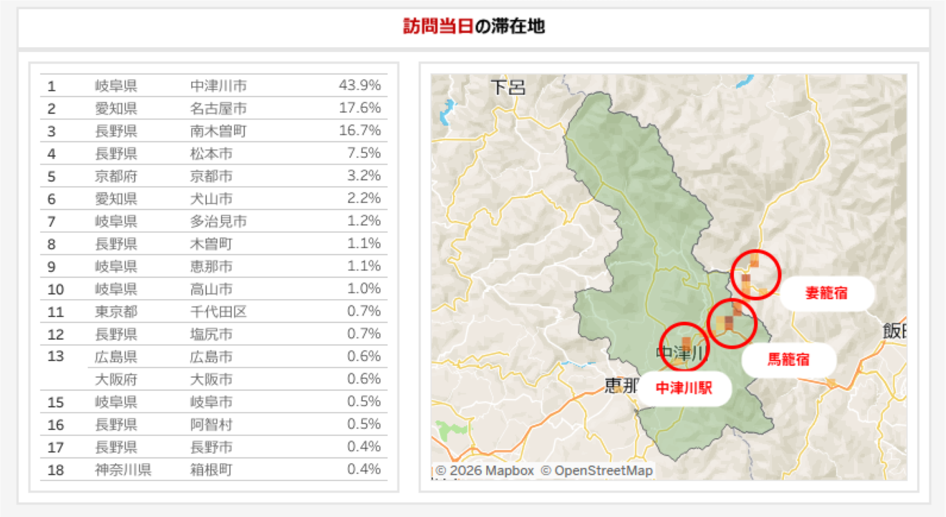 中津川市と中津川市に隣接する南木曽町内の滞在箇所を見ると、宿泊客・日帰り客ともに中津川駅や馬籠宿、妻籠宿に滞在していることが分かります。