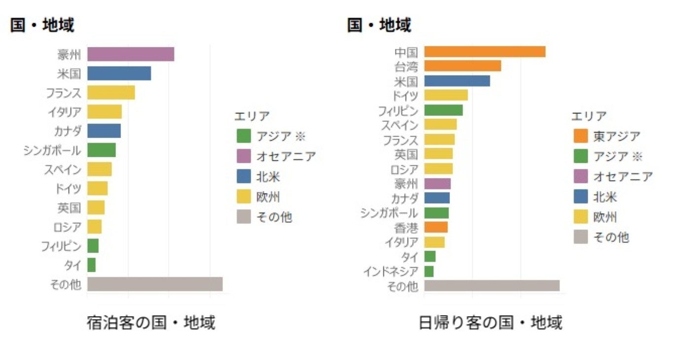 来訪者を国・地域別で見ると、中津川市に宿泊する観光客は欧米系が多く、日帰り客はアジア系が多いことが分かります。